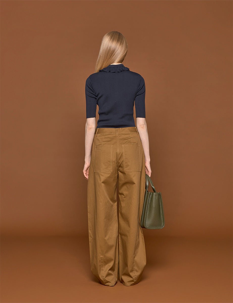Polo blu in maglia a costine, manica corta e fit slim. Chiusura a quattro bottoni, colletto con rouches e mano metallica gioiello con strass cucita sul davanti.