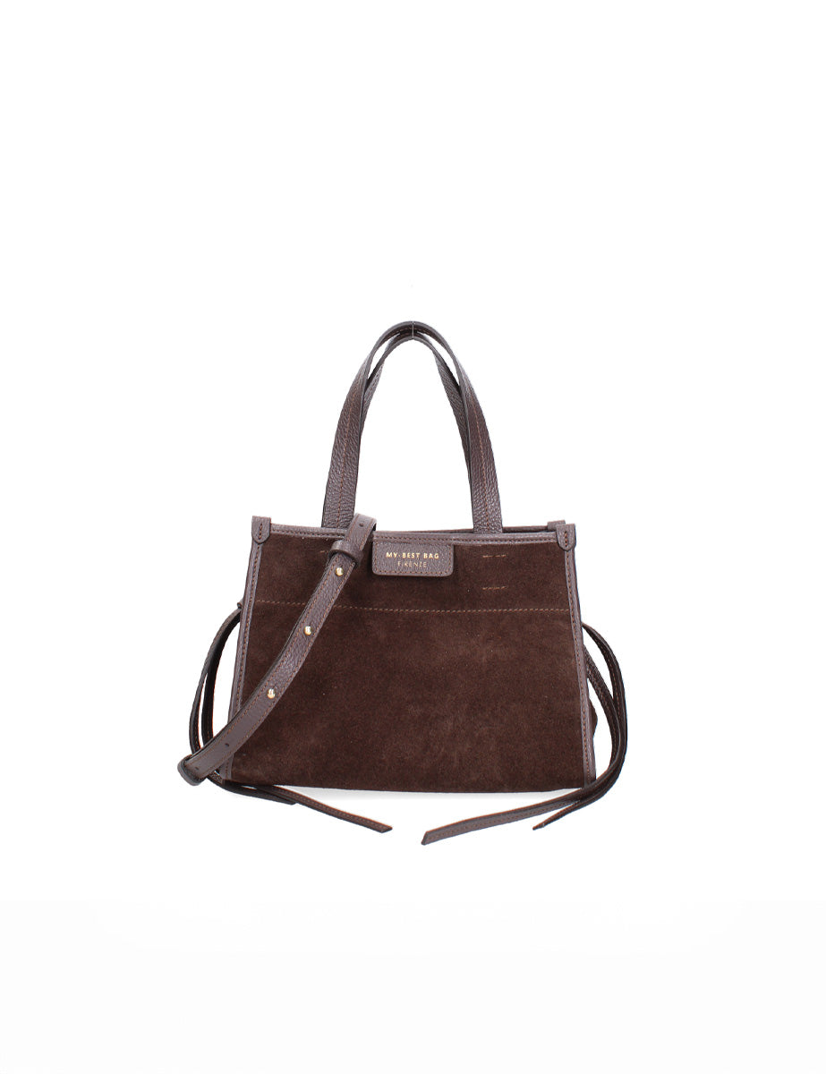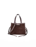 Borsa in pelle scamosciata color cioccolato con profili, manici e lacci in pelle in tono. Ampio scomparto interno, logo dorato impresso frontalmente e cuciture tono su tono. Tracolla regolabile e removibile in pelle in tono.