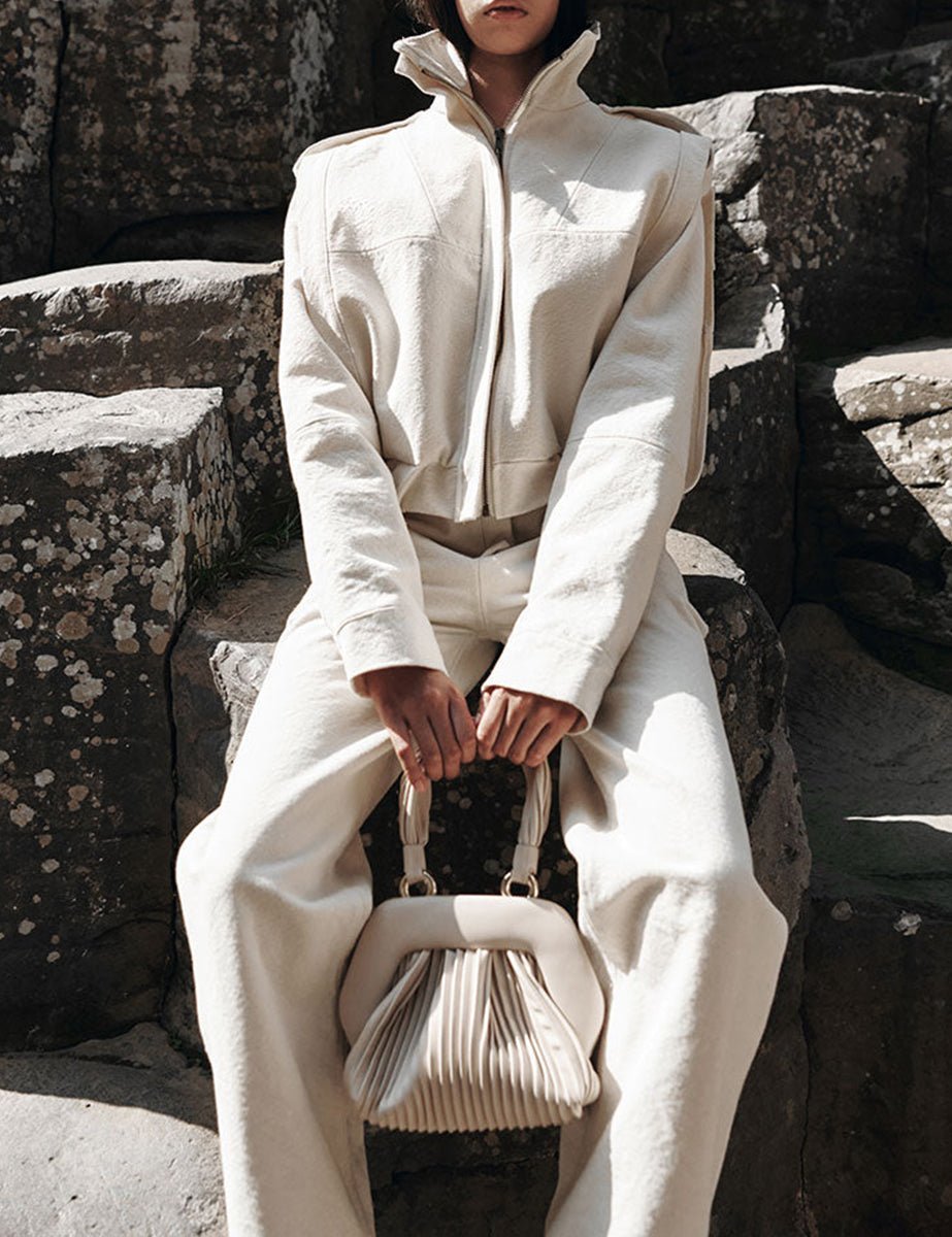 Realizzata nella variante bianco shell, questa borsa presenta un design stondato con drappeggio, dettagli con arricciature e plissettature e un unico scomparto interno, chiusura magnetica, manico superiore e tracolla regolabile e rimovibile.
