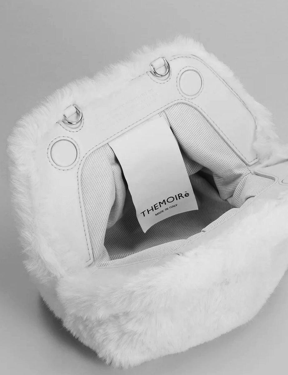 Realizzata nella variante in eco-fur color taupe, presenta un design stondato con drappeggio, dettagli con arricciature e un unico scomparto interno, chiusura magnetica e tracolla regolabile e rimovibile.