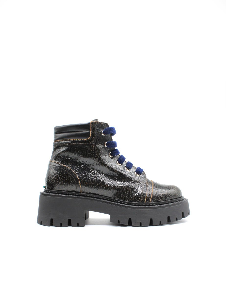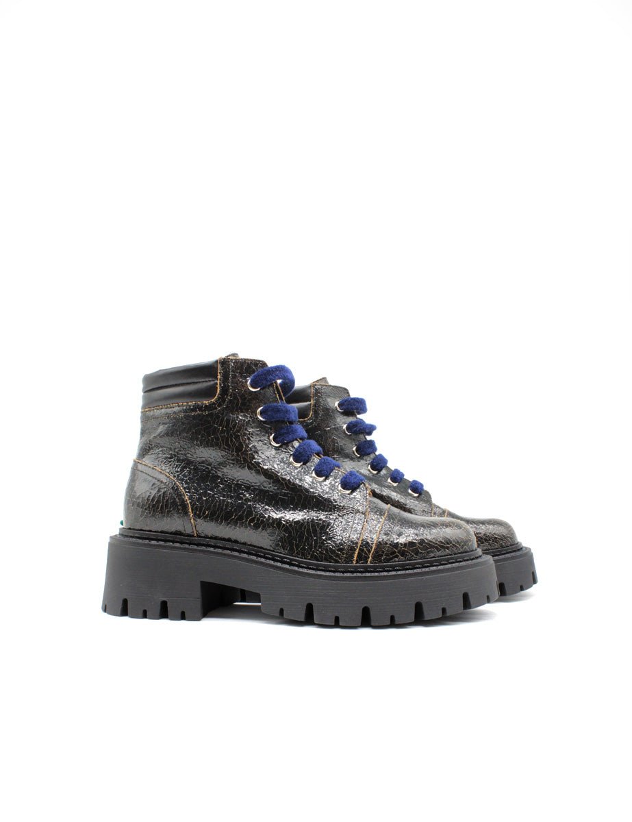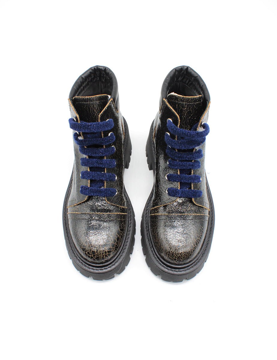 Stivaletto polacco in vera pelle spalmata effetto cracklè color nero, allacciatura stringata a 6 occhielli e stringhe in ciniglia color blu navy. Punta tonda e suola carrarmato in gomma.