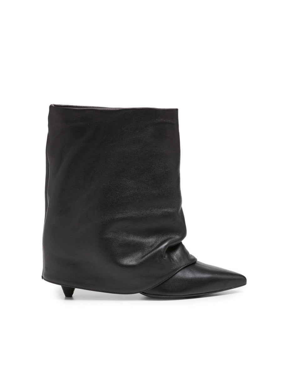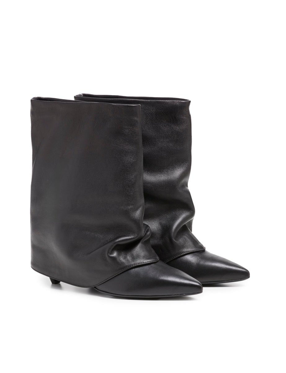 Stivale a punta in pelle nera, gambale a tubo largo con volume rimborsato, tacco a cono.