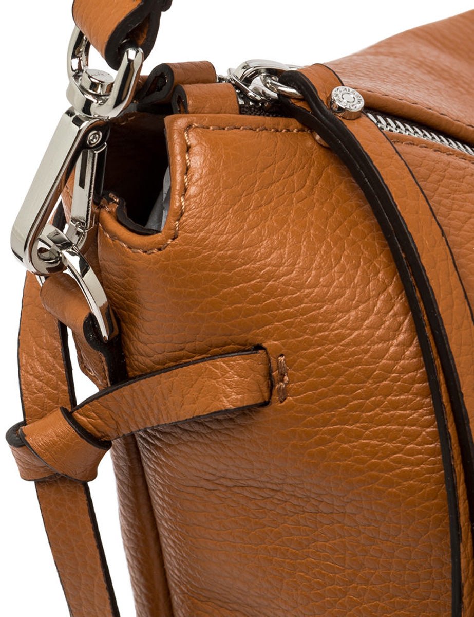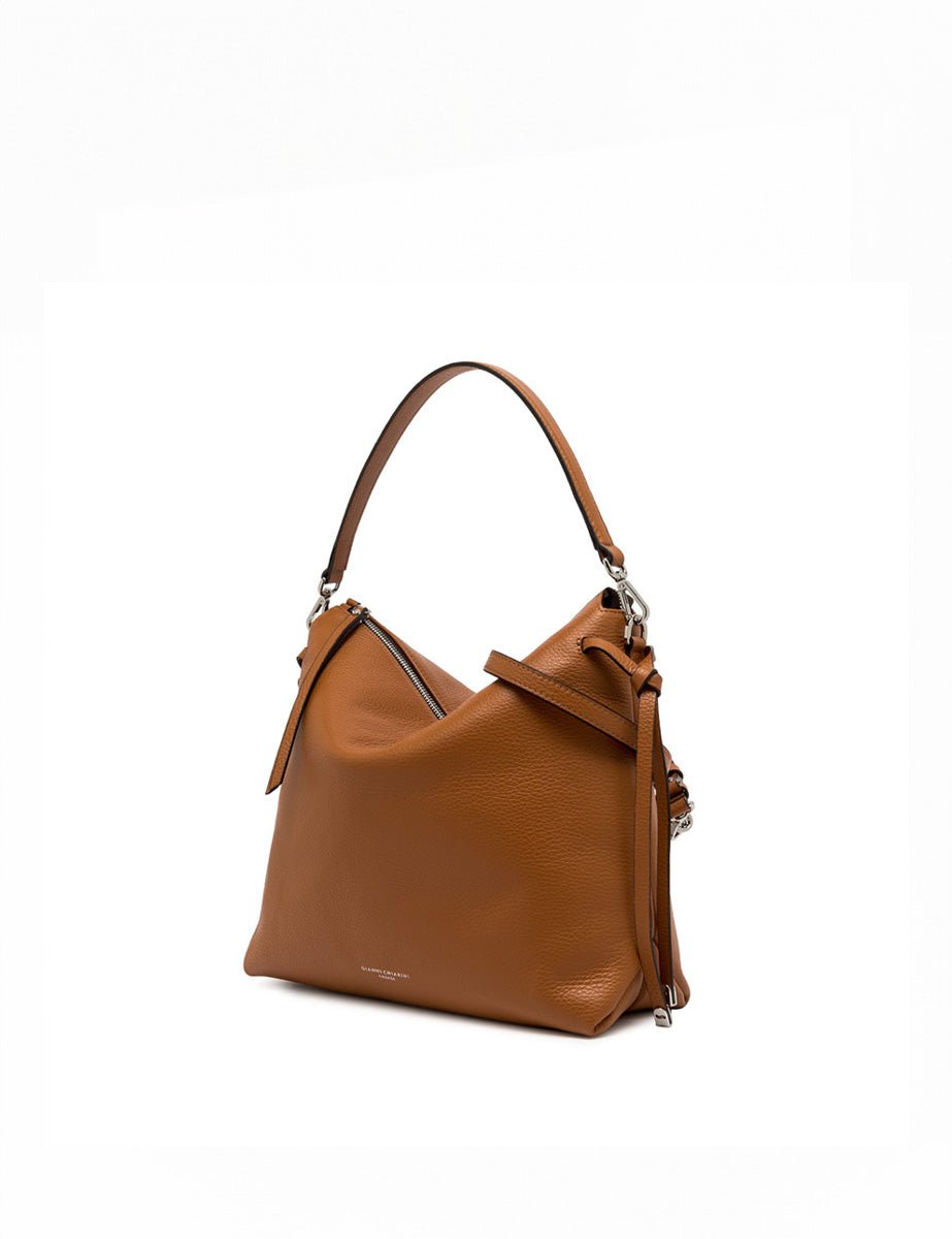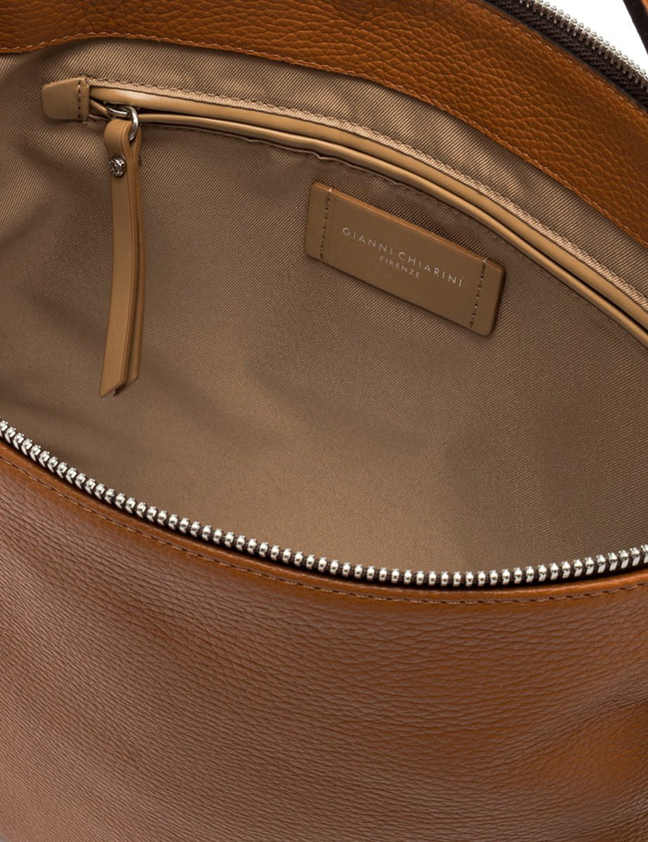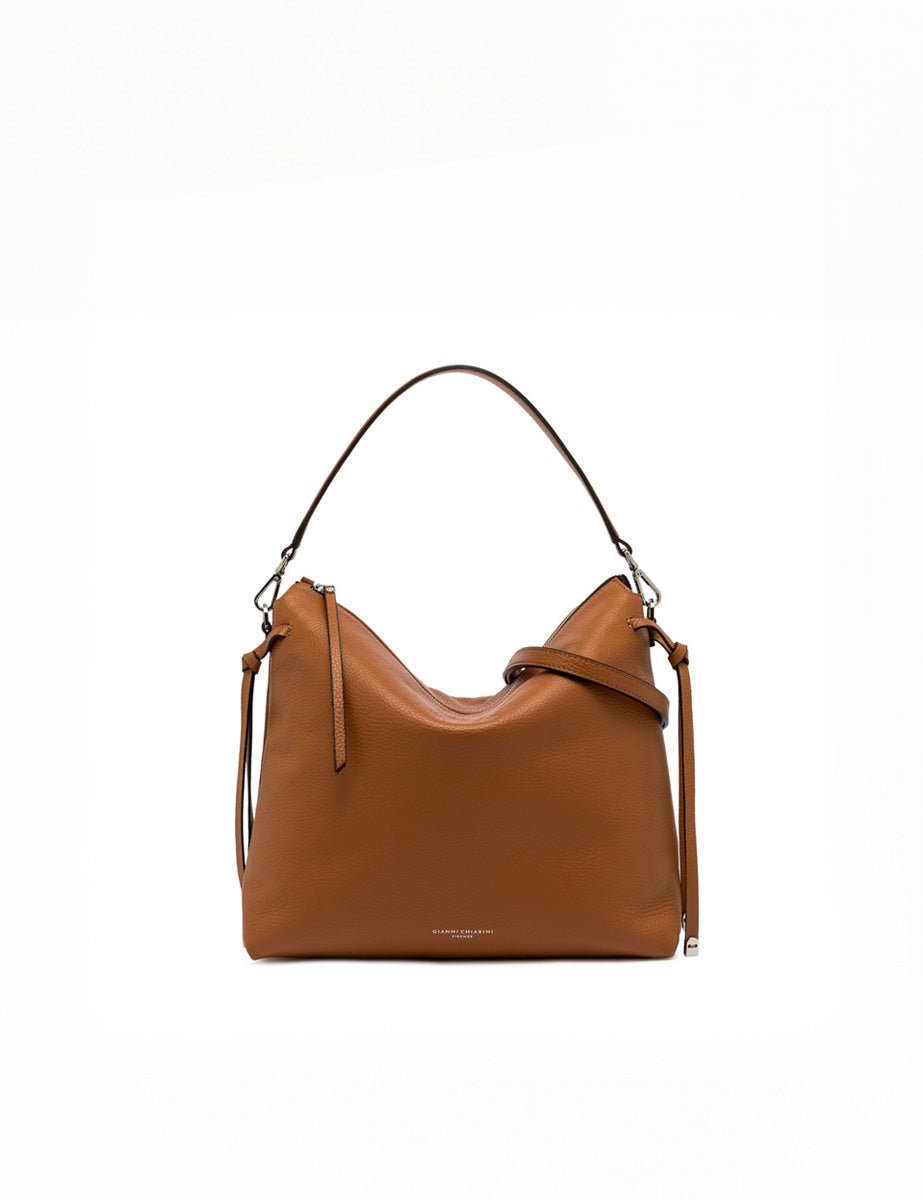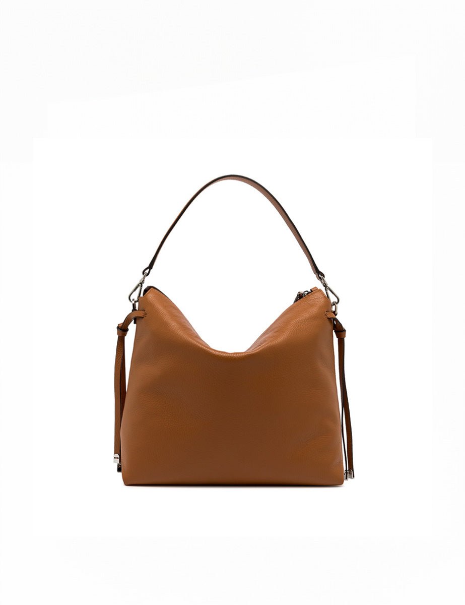 Borsa realizzata in pelle martellata color caramello. Presenta una chiusura superiore con zip, un manico in pelle e una tracolla regolabile e removibile. Dettagli annodati e componenti in metallo aggiungono un tocco luminoso.