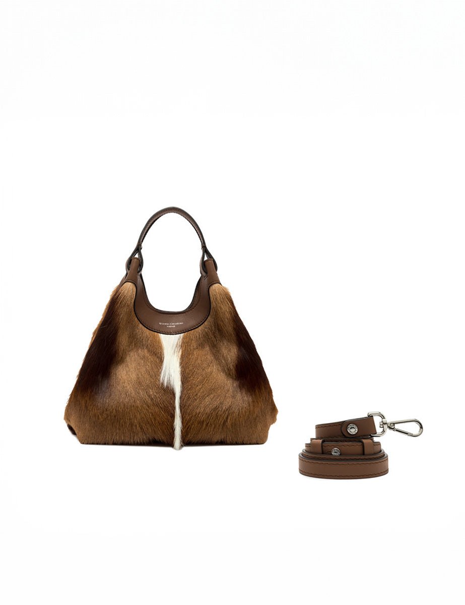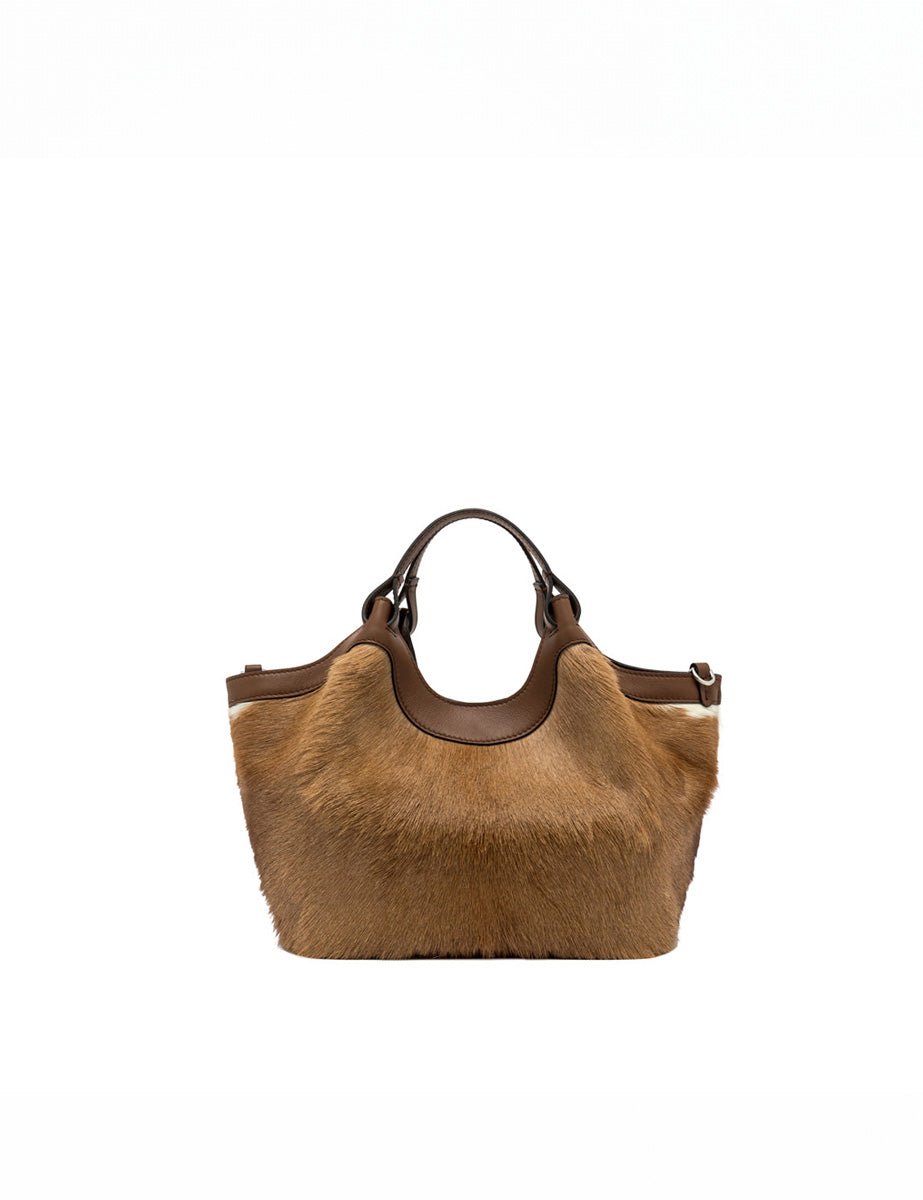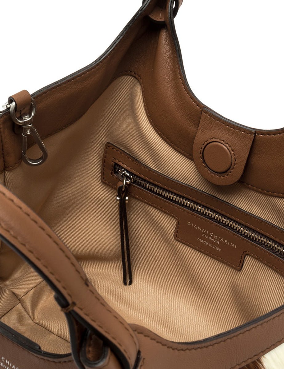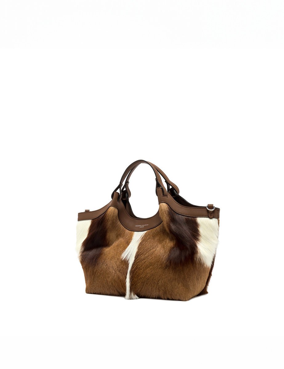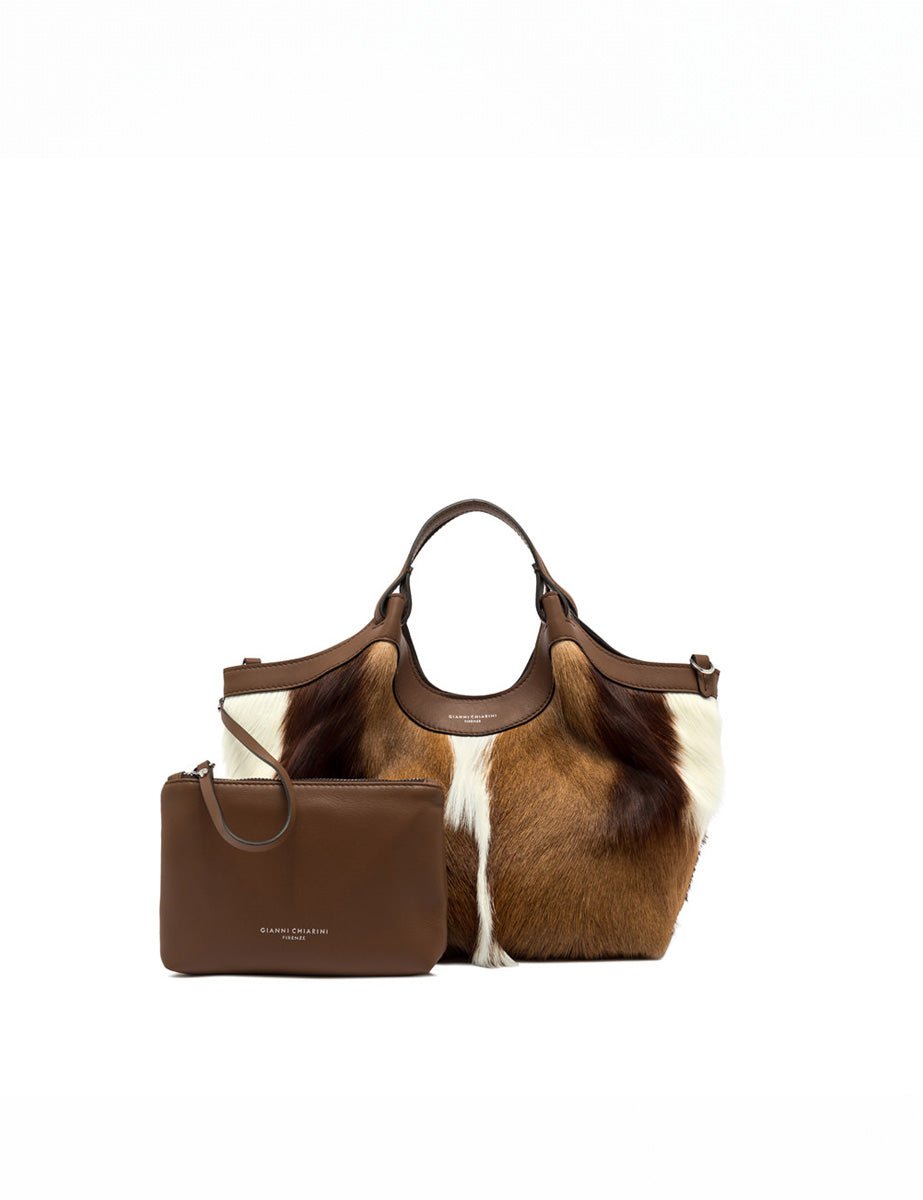 Borsa realizzata in cavallino e interno foderato con tela di cotone in tono. Questa borsa presenta due manici in pelle color moro, pinces che definiscono il volume e una pratica chiusura magnetica superiore. Da portare a mano o con la tracolla regolabile e rimovibile. Internamente una pratica pochette removibile realizzata nella stessa pelle.