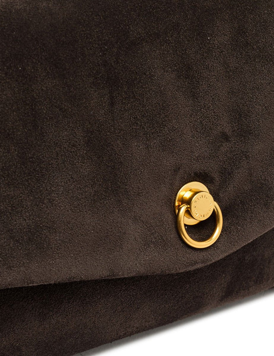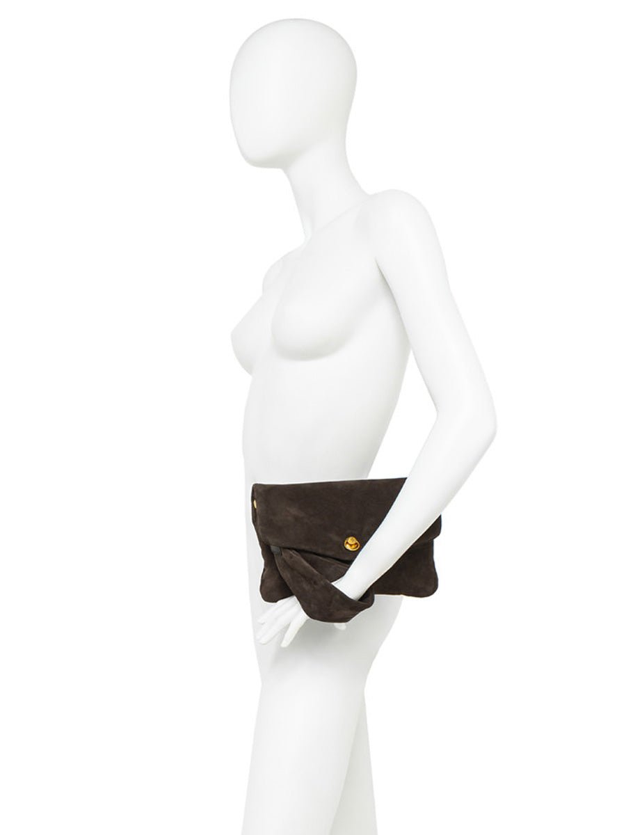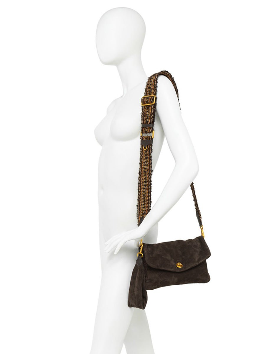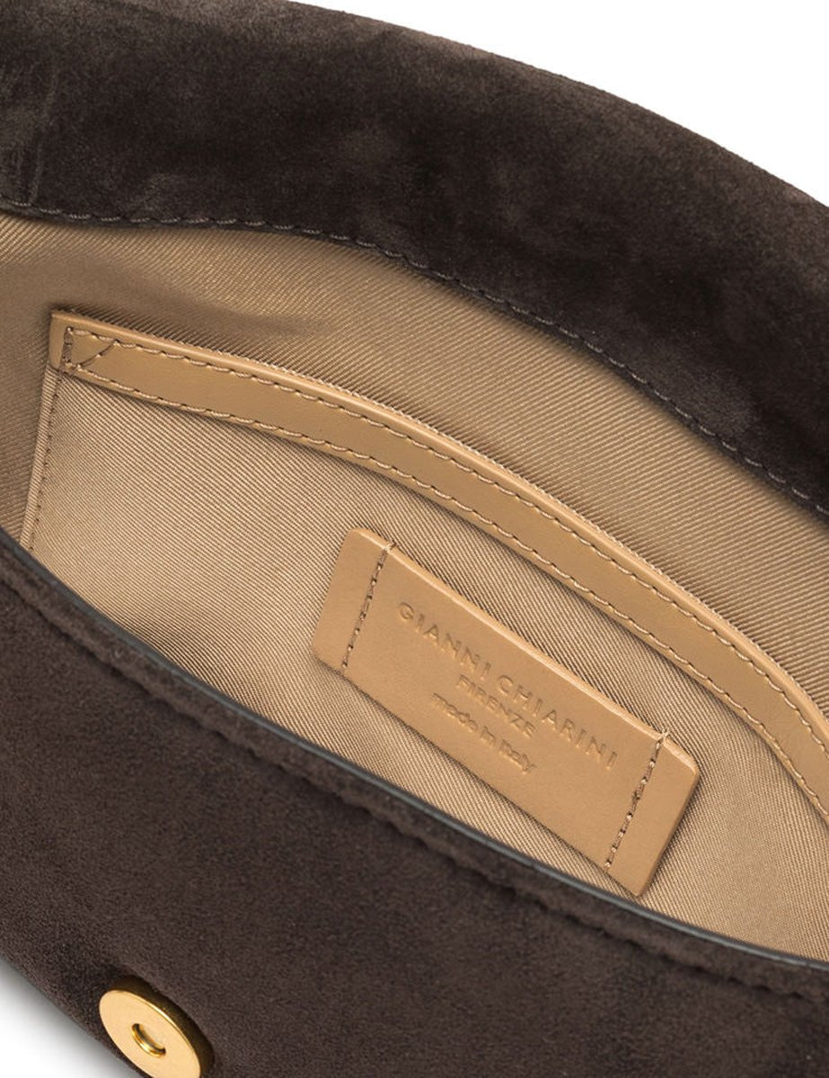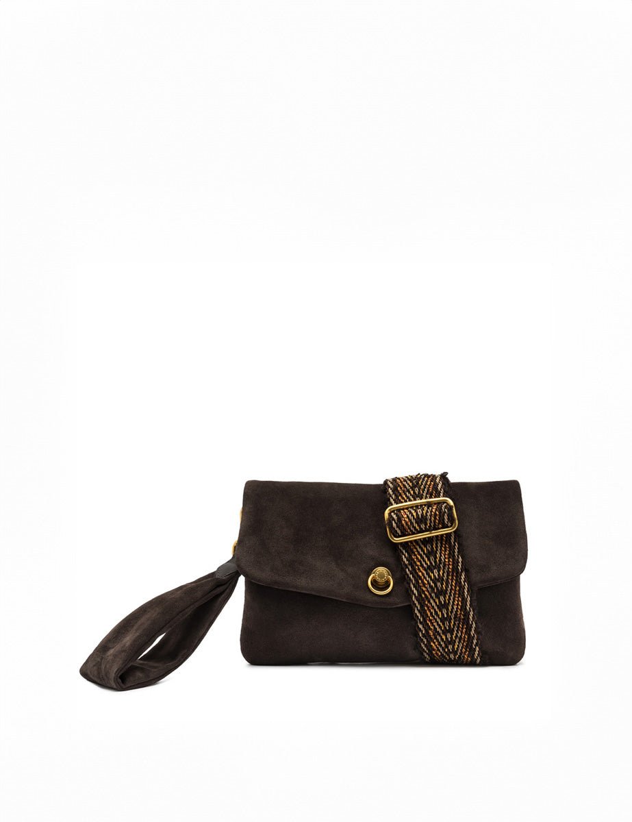Pochette in morbida pelle scamosciata color caffè, chiusura con patta con dettaglio piercing logato e bottone magnetico. Maxi cinturino da polso removibile tramite moschettone e tracolla in tape anch'essa regolabile e removibile.