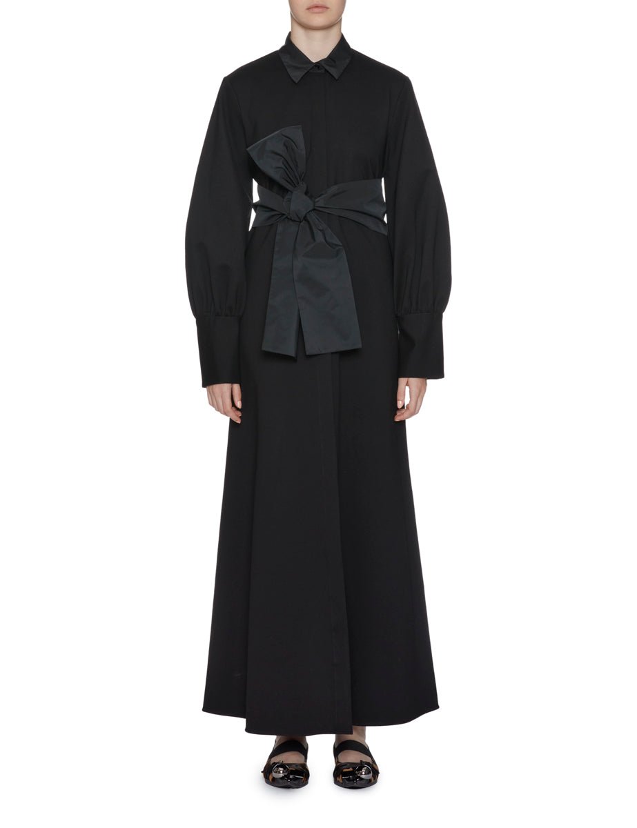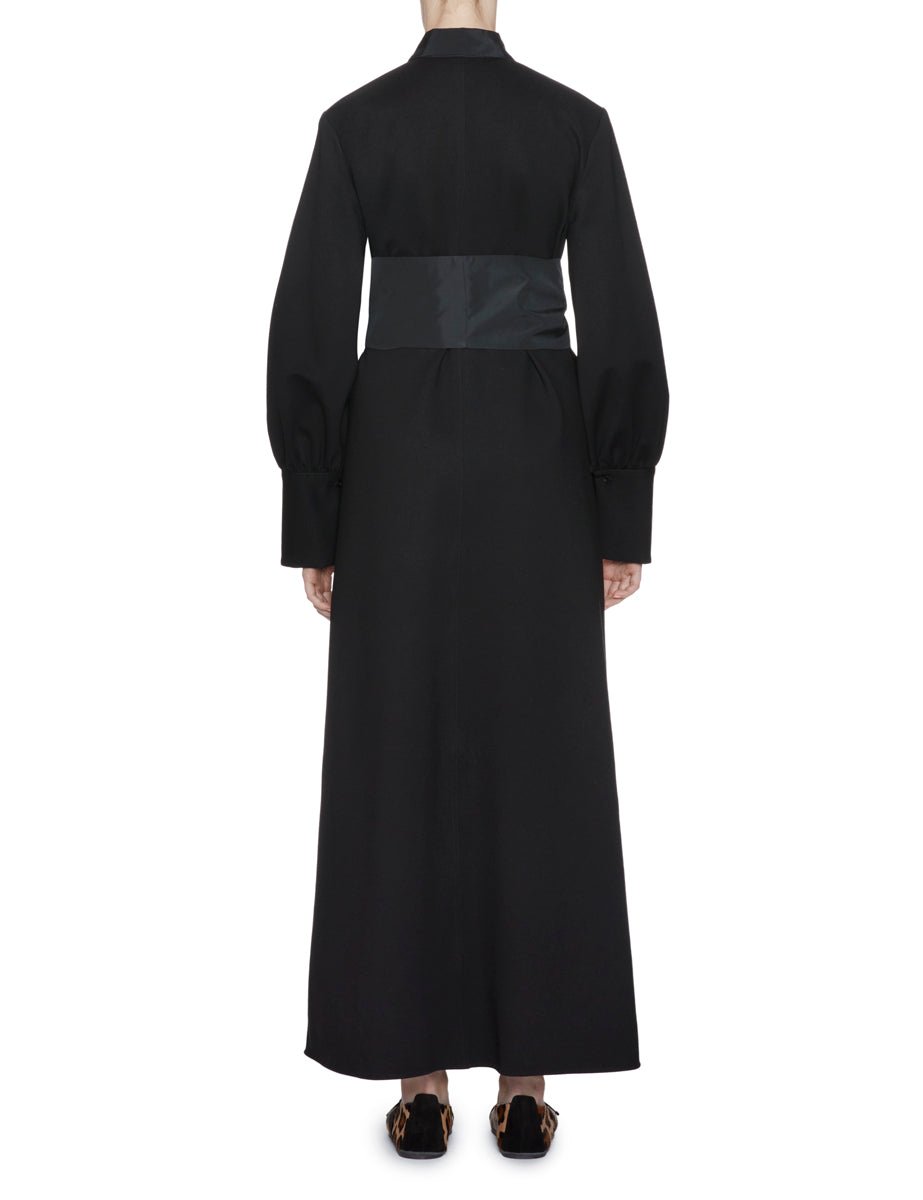 Abito chemisier in viscosa stretch color nero con colletto e fusciacca in taffetà in tono. Abbottonatura frontale ricoperta, manica a palloncino che chiude in un alto polso a camicia. Volume svasato al fondo.