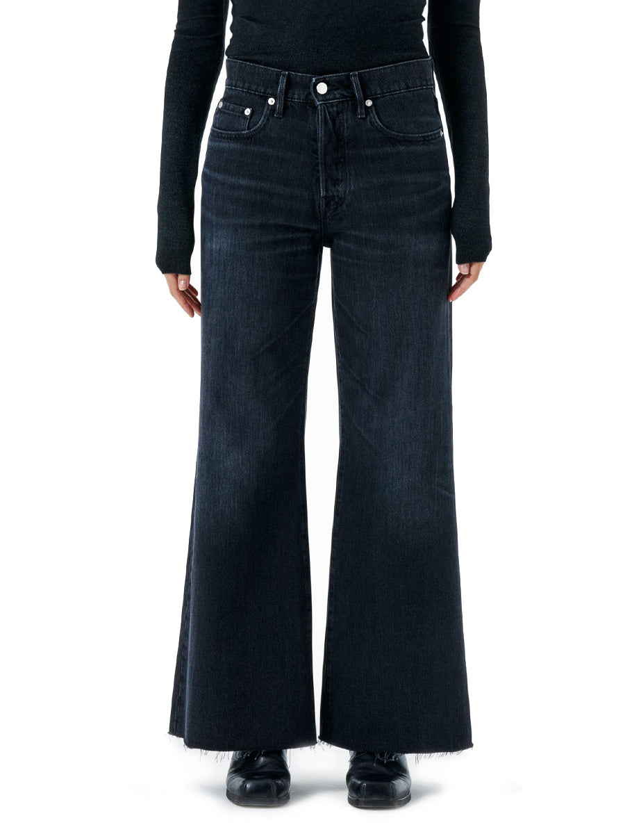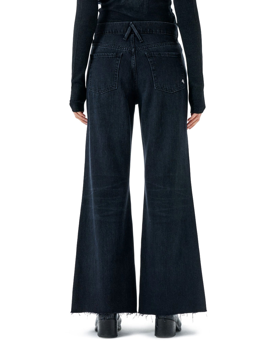 Jeans flared in denim lavaggio nero, chiusura frontale con bottone e zip. Modello 5 tasche con passanti in tessuto e cuciture in tono.