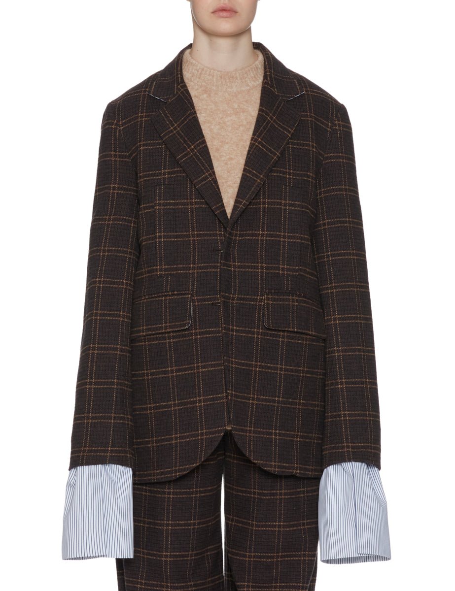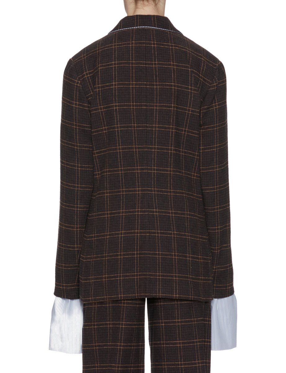 Blazer color cacao in cotone con motivo finestrato in tono, collo revers e abbottonatura monopetto nascosta. Tasche a patta frontali e a filetto al petto, polsini removibili in popeline a righe.