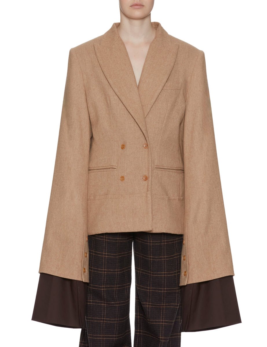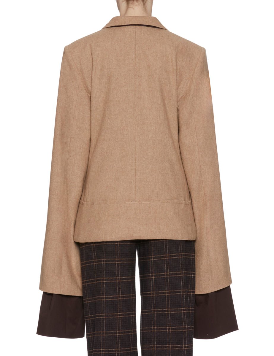 Blazer doppiopetto in flanella di lana color cammello, volume morbido e sagomato. Collo a revers, tasche a doppio filetto frontali e a filetto al petto. Manica svasata con polsino removibile in popeline di cotone color cacao e banda rimessa nel fondo busto.