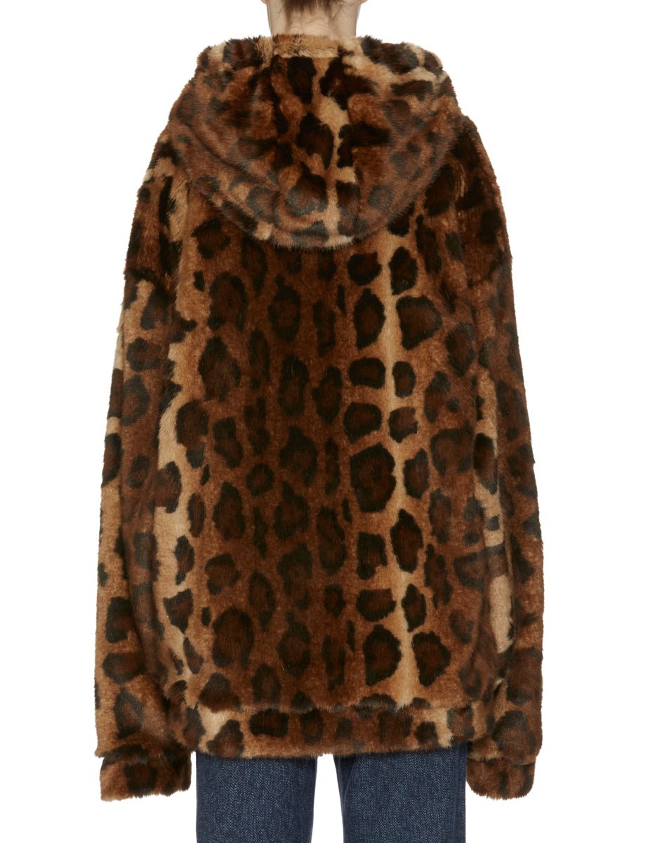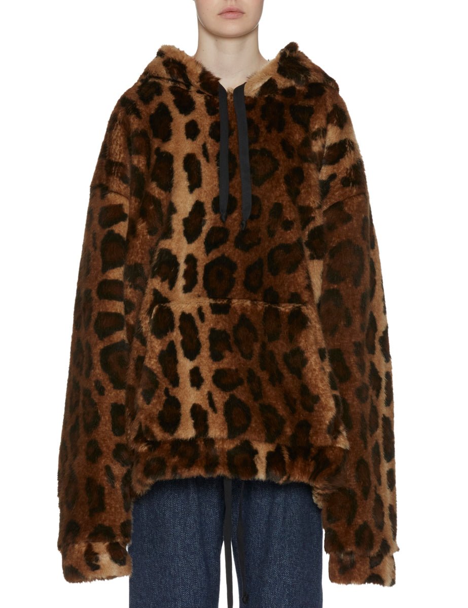 Felpa in ecopelliccia con stampa leopardata sui toni del beige, moro e bruciato. Cappuccio con coulisse, spalla scesa e tasca a marsupio frontale. Volume oversize.