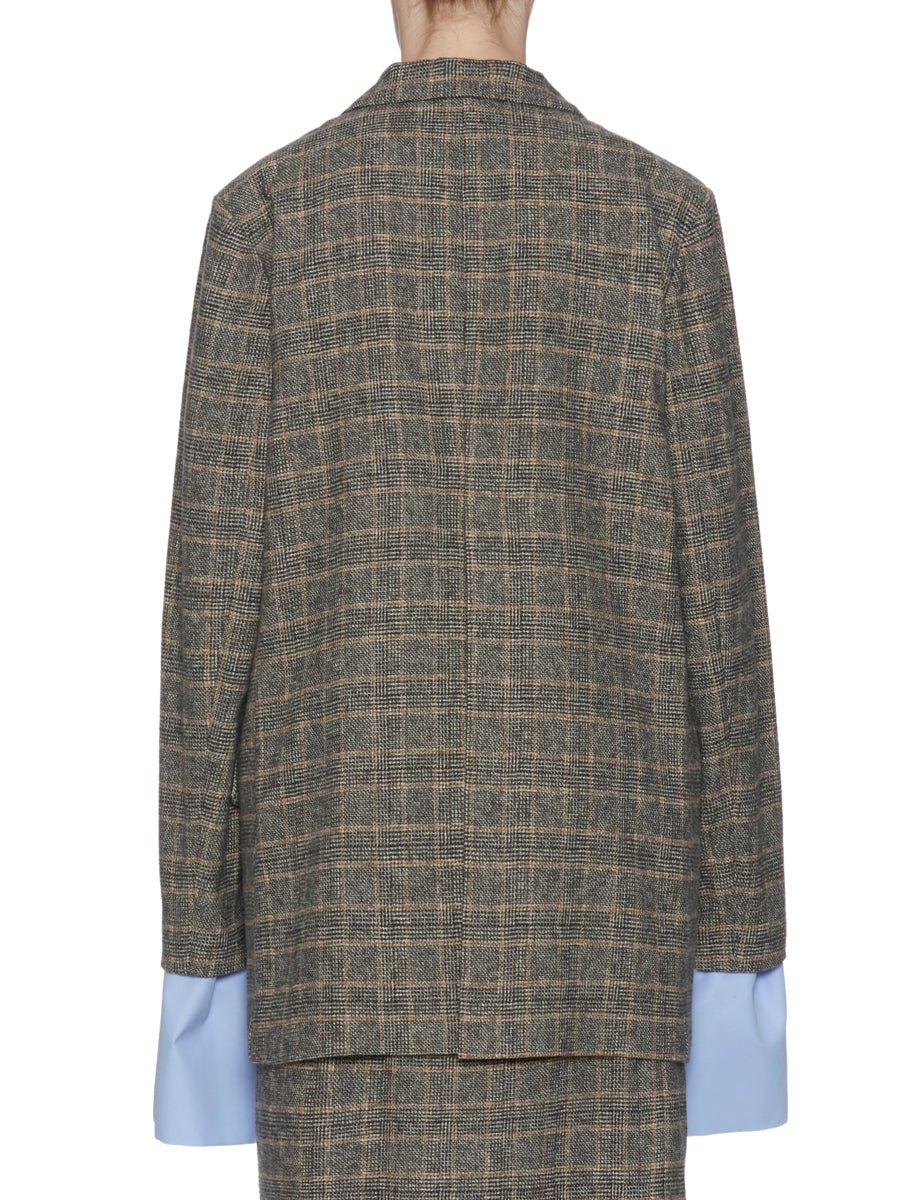 Blazer in cotone con motivo principe di galles grigio e beige, collo revers e abbottonatura monopetto. Tasche a patta frontali e a filetto al petto, polsini removibili in popeline azzurro. Presenta uno spacco nel centro dietro.