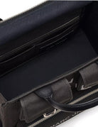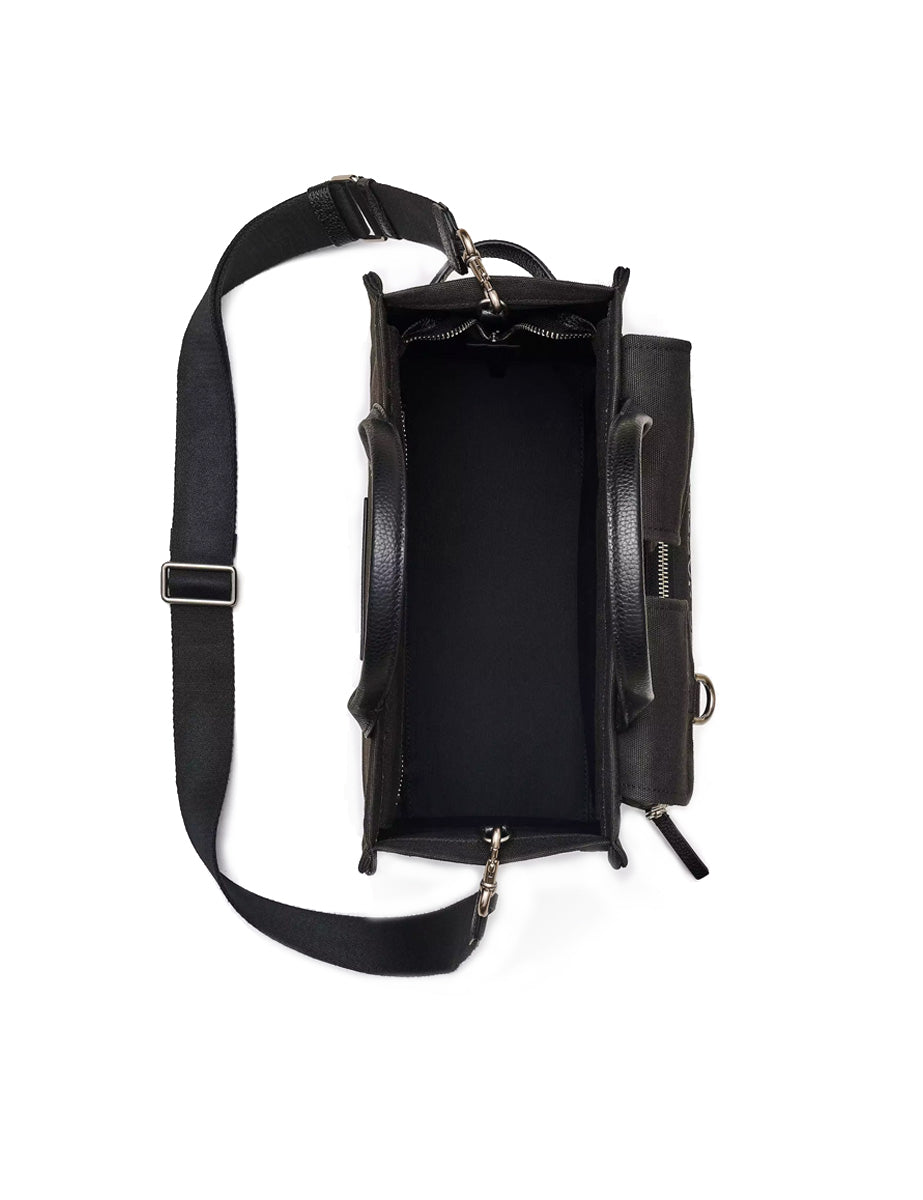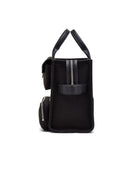 Borsa realizzata in tela di cotone color nero. Presenta una chiusura superiore con zip, tre tasche a toppa frontali, il logo ricamato a contrasto e un ampio scomparto interno. Da portare con i manici superiori realizzati in pelle nera o con la tracolla in tape regolabile e rimovibile.