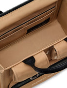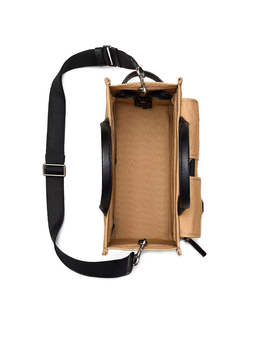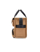 Borsa realizzata in tela di cotone color cammello. Presenta una chiusura superiore con zip, tre tasche a toppa frontali, il logo ricamato in tono e un ampio scomparto interno. Da portare con i manici superiori realizzati in pelle nera o con la tracolla in tape regolabile e rimovibile.