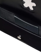 Borsa a spalla realizzata in pelle spazzolata lucida color nero, silhouette elegante e minimale. Presenta una chiusura magnetica ad aletta, il logo metallico frontale e uno specchio a margherita nascosto internamente, sotto la patta. Tasca interna a bustina e una tracolla regolabile in pelle in tono.