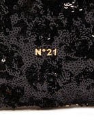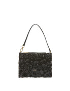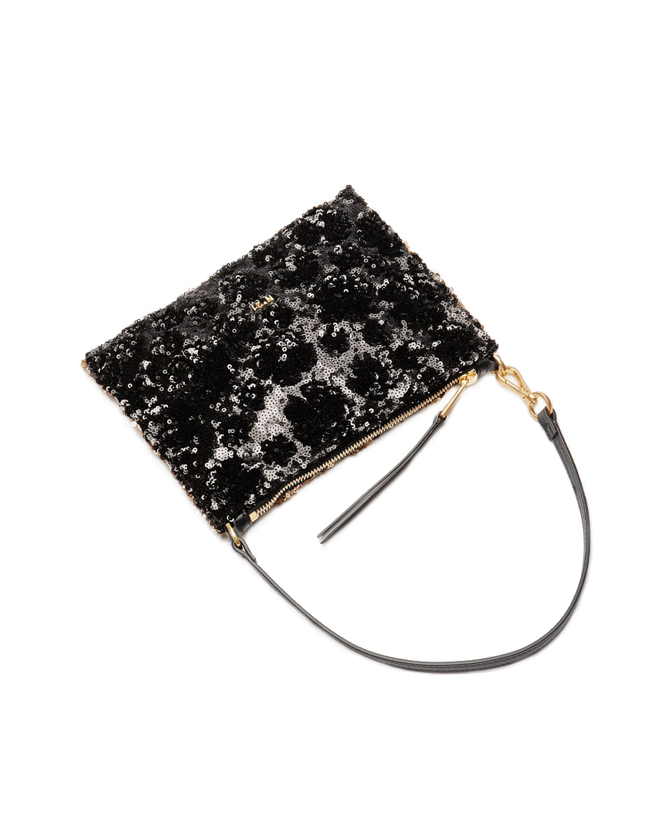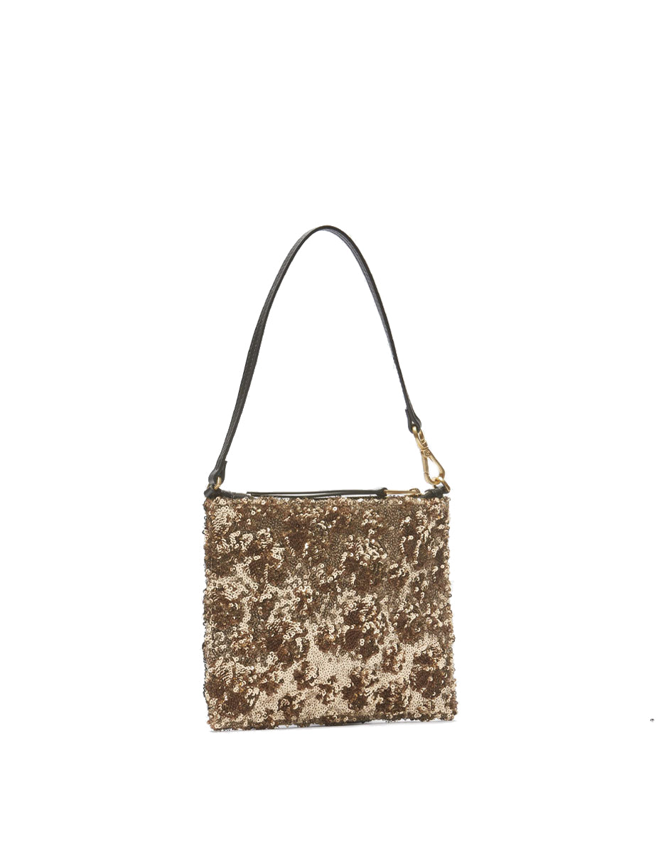 Pochette a spalla realizzata in tessuto ricoperto di paillettes in due tonalità, nero e oro. Presenta una struttura rettangolare con chiusura a zip e una tracolla corta con dettagli metallici dorati. Da portare a mano o a spalla.