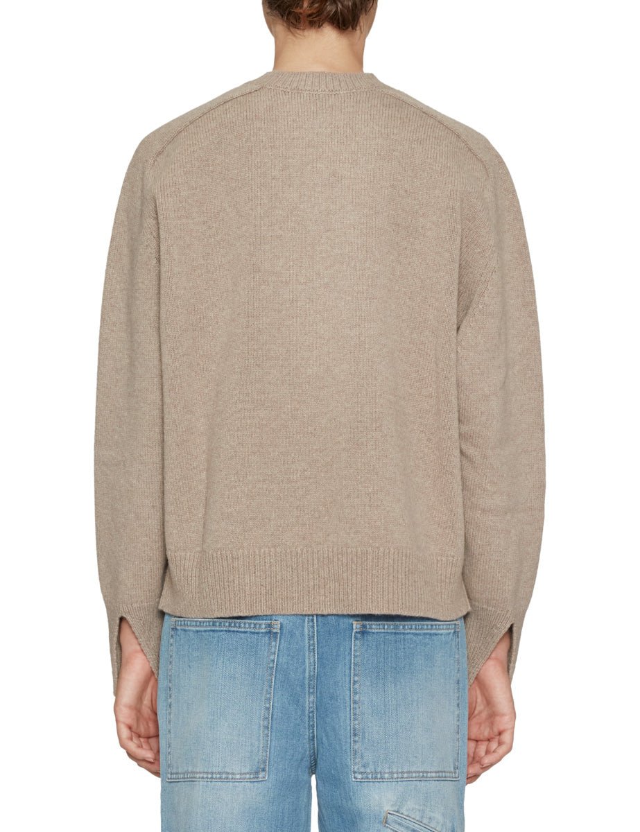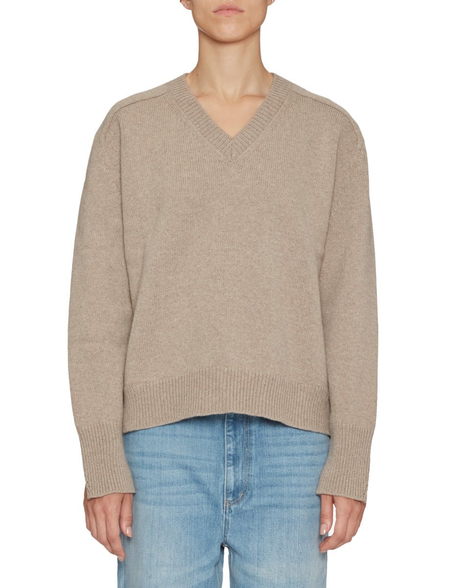 Maglia in misto lana e cashmere color taupe, scollo a "V", spalla scesa e spacchi laterali ai polsi. Finiture collo, fondo e polsi in costa.
