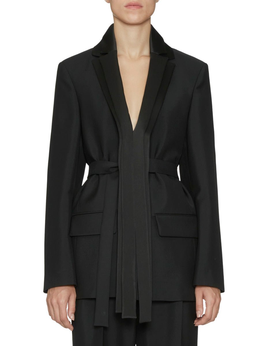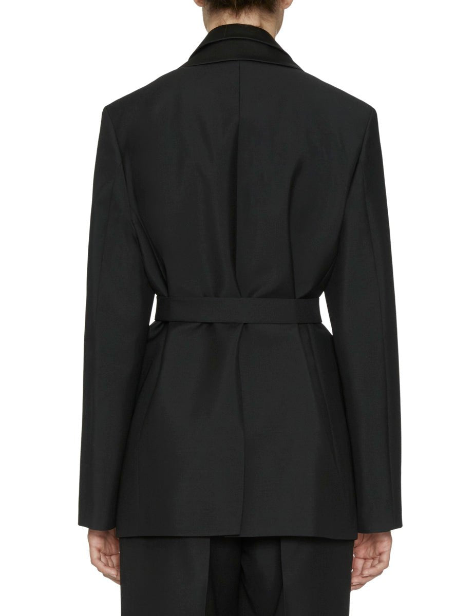 Blazer destrutturato in fresco di lana color nero, doppio collo revers in raso in tono. Volume sganciato, tasche a patta frontali e cintura da stringere in vita, spacco posteriore nel centro dietro.