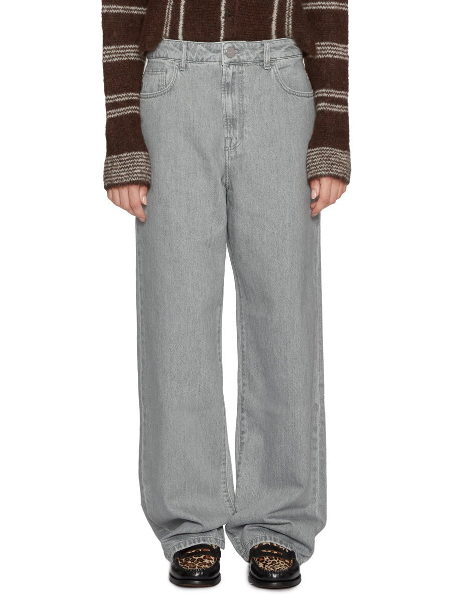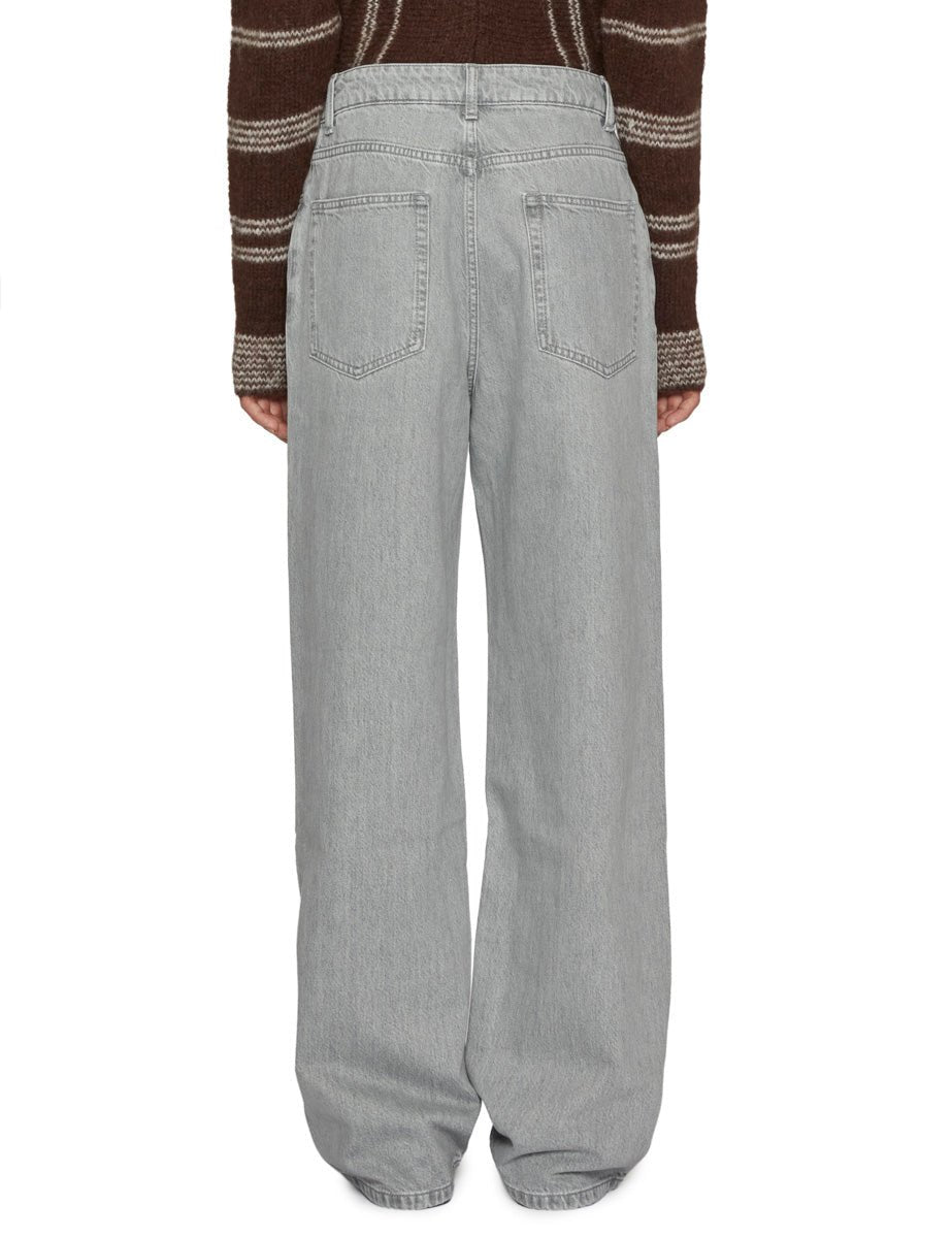 Jeans baggy fit in denim lavaggio grigio medio, chiusura frontale con bottone e zip. Modello 5 tasche con passanti in tessuto.