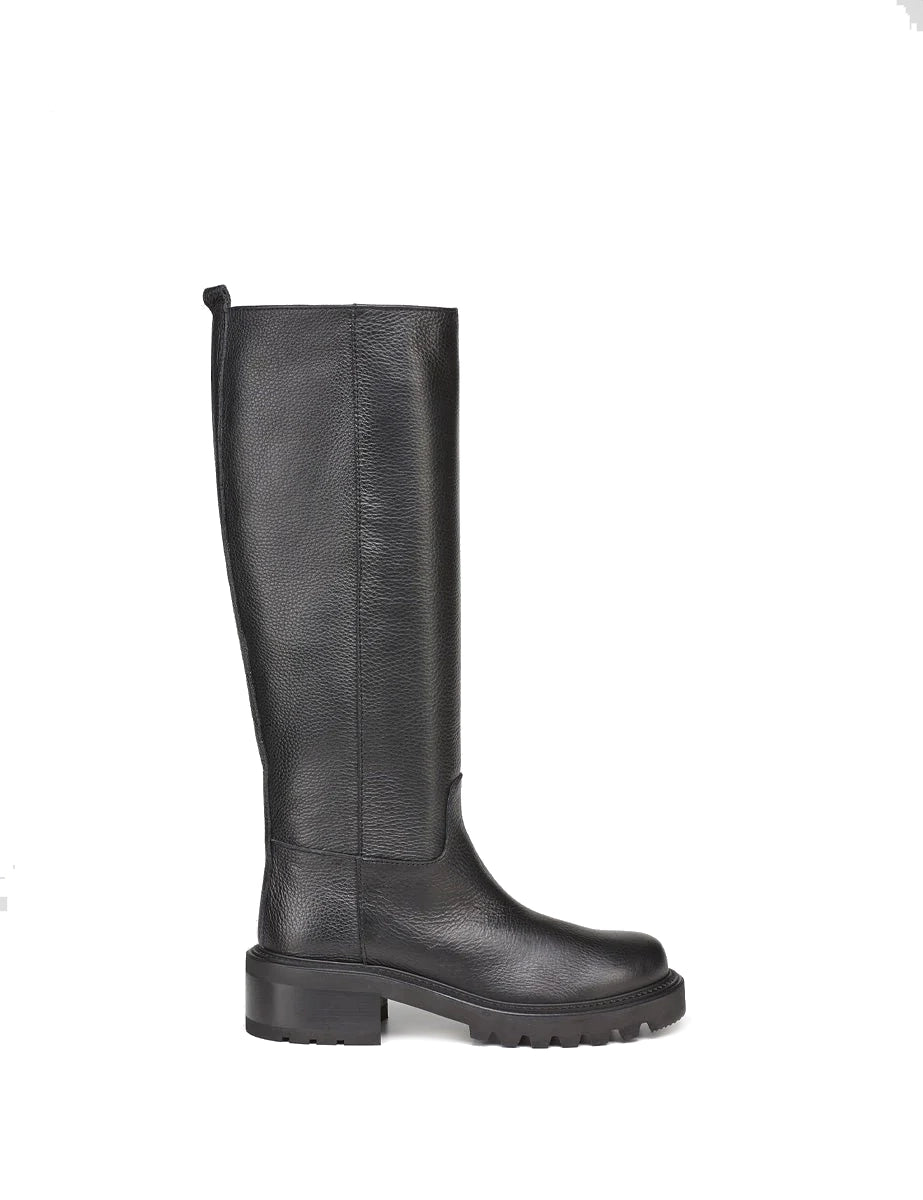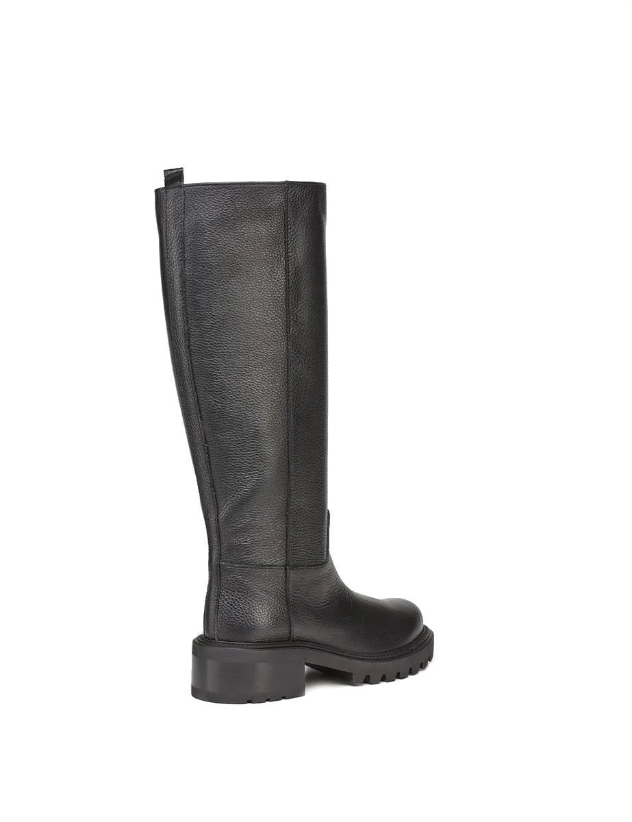 Biker in vera pelle nera martellata, gambale dritto a tubo e linguetta posteriore, suola carrarmato, tacco largo e punta tonda.