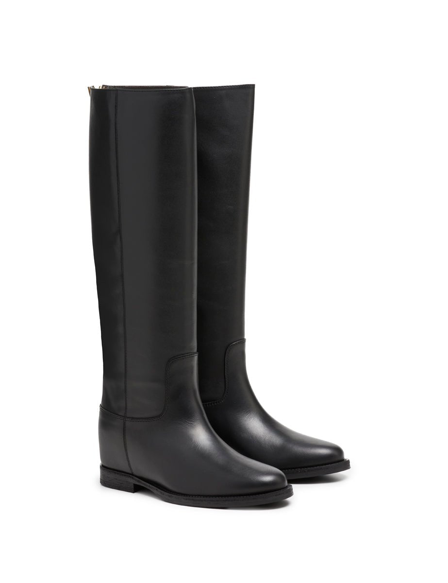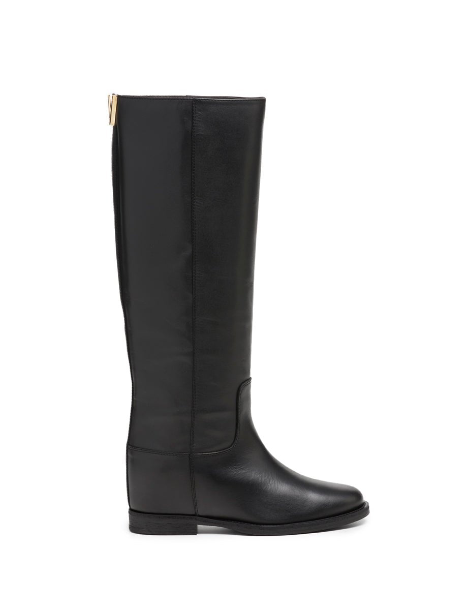 Stivale in vera pelle color nero, gambale largo e alto che termina posteriormente con un accessorio portalogo metallico a “V” color oro. Soletta removibile rialzata internamente sul tallone e punta tonda.
