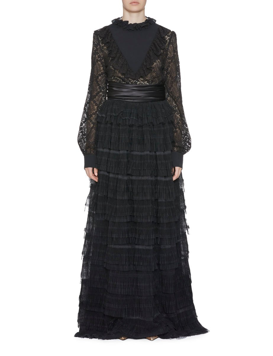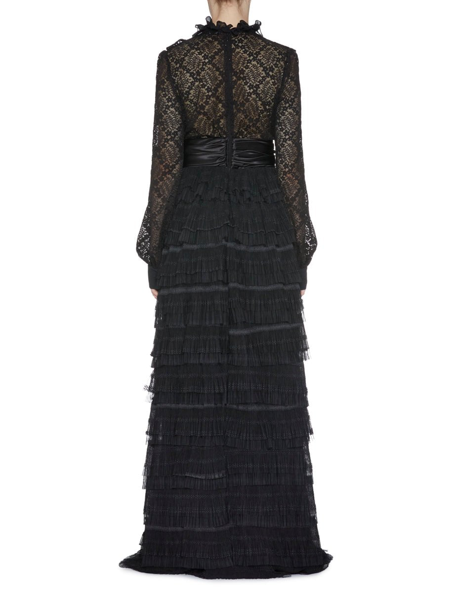 Abito lungo in pizzo nero, girocollo con plastron a "V" in tessuto coprente nero e rouches. Chiusura centro dietro con zip a vista, cintura in vita in raso a pieghe irregolari, maniche a sbuffo con polso a camicia. Gonnellone svasato a balze regolari.