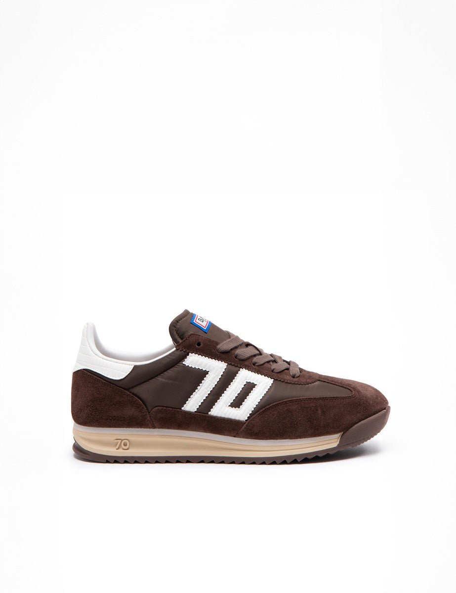 Sneaker in suede color caffè con inserti in nylon in tono. Dettaglio portalogo laterale in pelle texturizzata bianca e linguetta brandizzata, chiusura frontale con lacci in cotone color cacao e punta tonda.