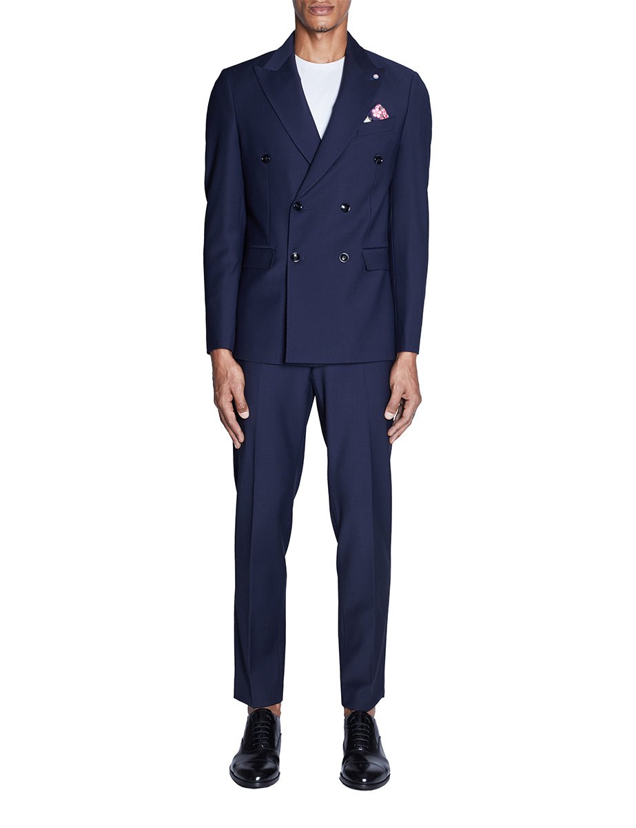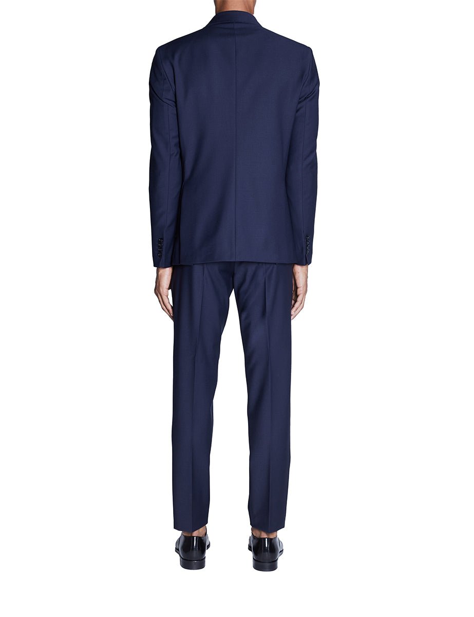 Abito in misto lana e viscosa color blu oltremare. La giacca presenta una chiusura monopetto, collo revers, tasche a patta frontali e al petto una tasca a filetto con pochette. Ad arricchire il capo un’ impuntura AMF su collo e tasche. Posteriormente spacchi laterali al fondo.