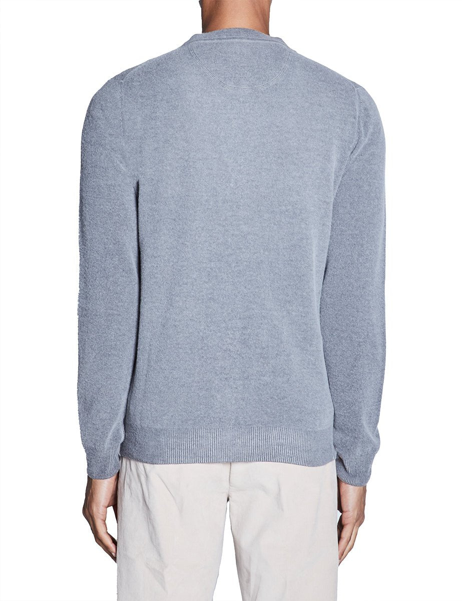 Cardigan reversibile in lana color grigio melange, scollo a “V” e abbottonatura frontale con bottoni a contrasto. Finitura polsi e fondo in costina.