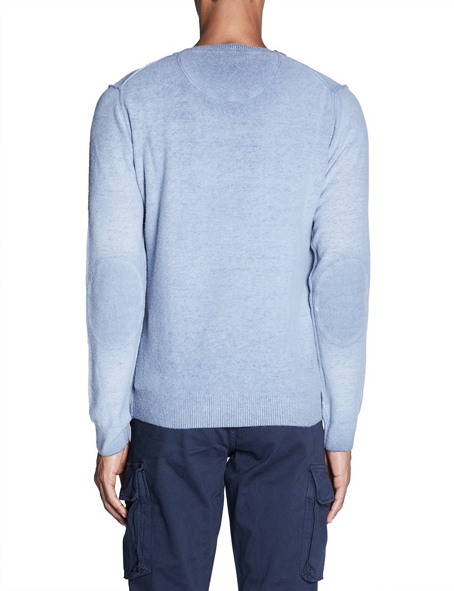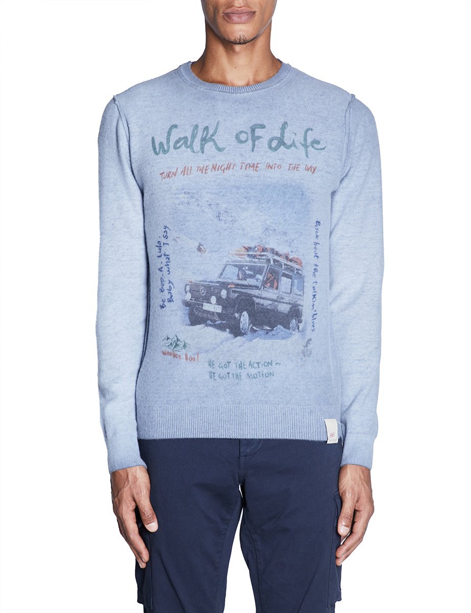 Pullover reversibile in maglia di lana color blu delavè con stampa frontale, finiture collo, polsi e fondo in costa.