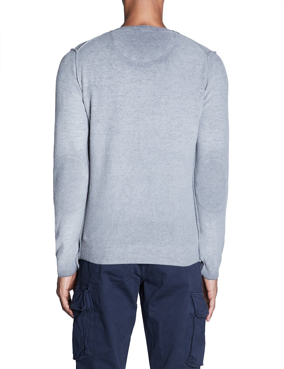 Pullover reversibile in maglia di lana color grigio melange delavè con stampa frontale, finiture collo, polsi e fondo in costa.