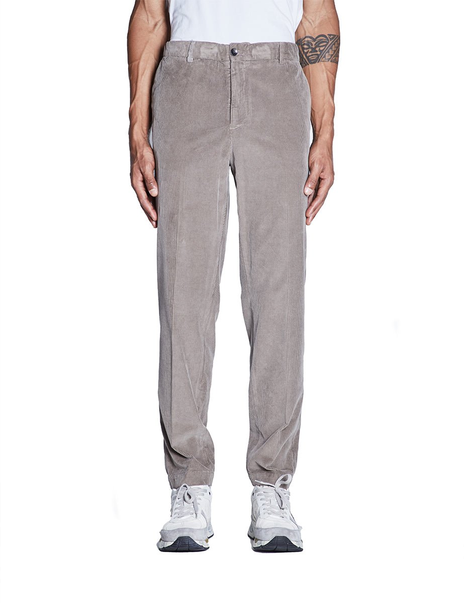 Pantalone in velluto millerighe color beige, chiusura con bottone e zip , tasche alla francese frontali e a filetto con chiusura a bottone posteriormente. Gamba dritta, passanti in tessuto ed elastico in cintura.