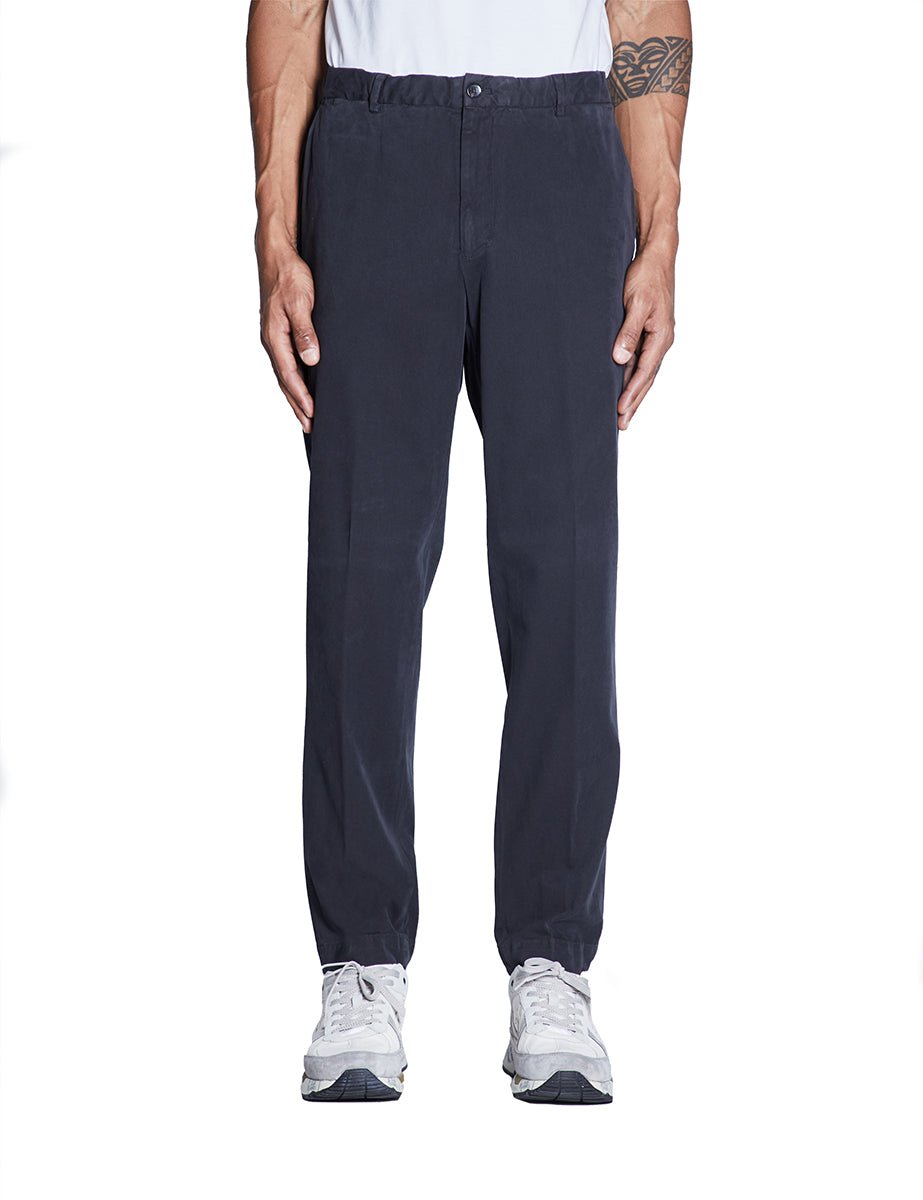 Pantalone in tela di cotone e modal color blu oltremare, chiusura con bottone e zip , tasche alla francese frontali e a filetto con chiusura a bottone posteriormente. Gamba dritta, passanti in tessuto ed elastico in cintura.