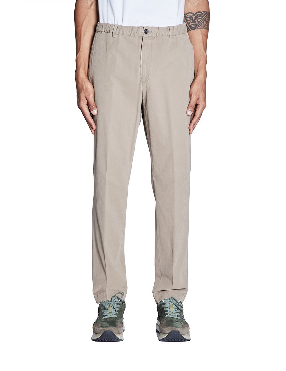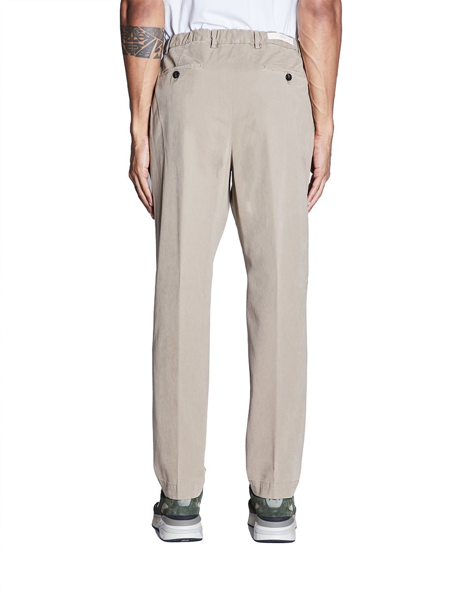 Pantalone in tela di cotone e modal color beige, chiusura con bottone e zip , tasche alla francese frontali e a filetto con chiusura a bottone posteriormente. Gamba dritta, passanti in tessuto ed elastico in cintura.