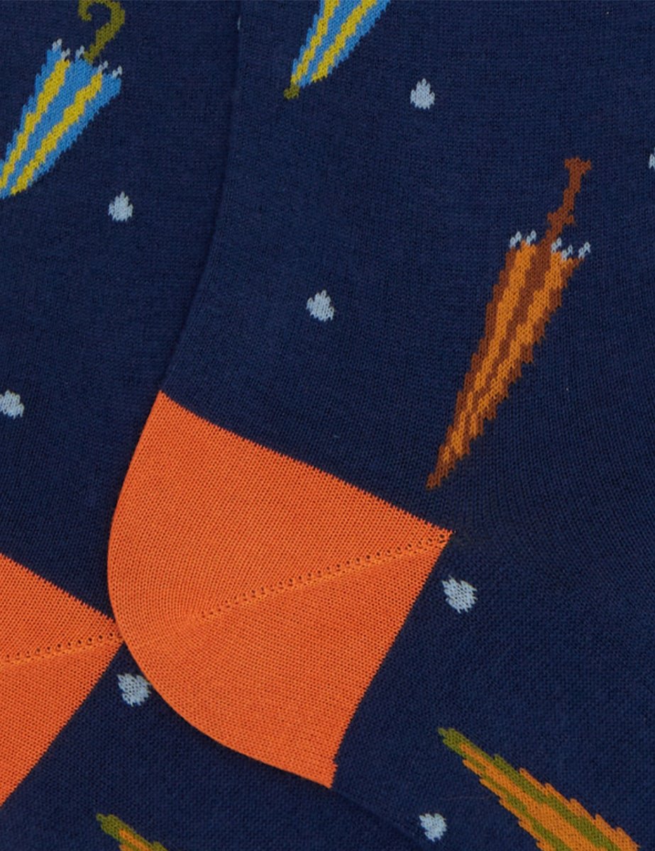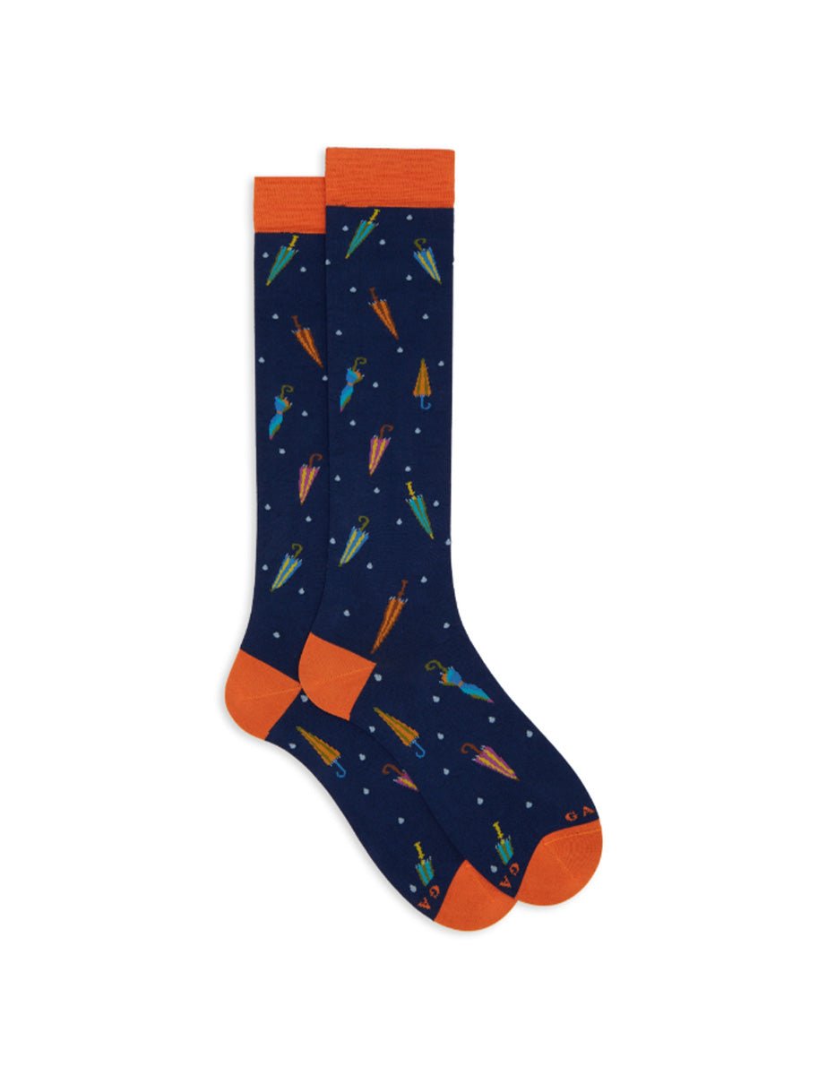 Calze lunghe da uomo, jacquard fantasia ombrelli e pois multicolor. Punta, tallone e gambale alto color zucca e logo Gallo riportato in punta a contrasto.