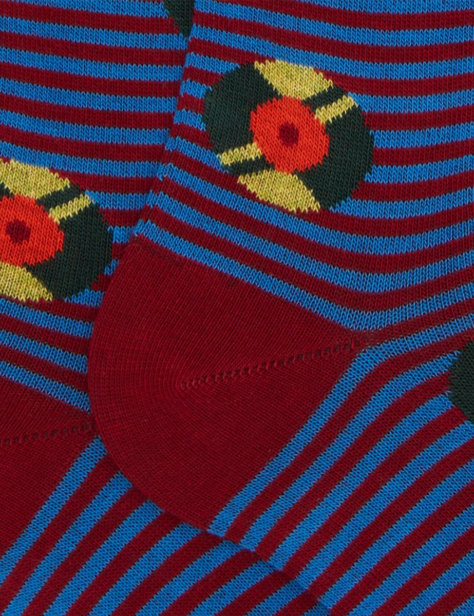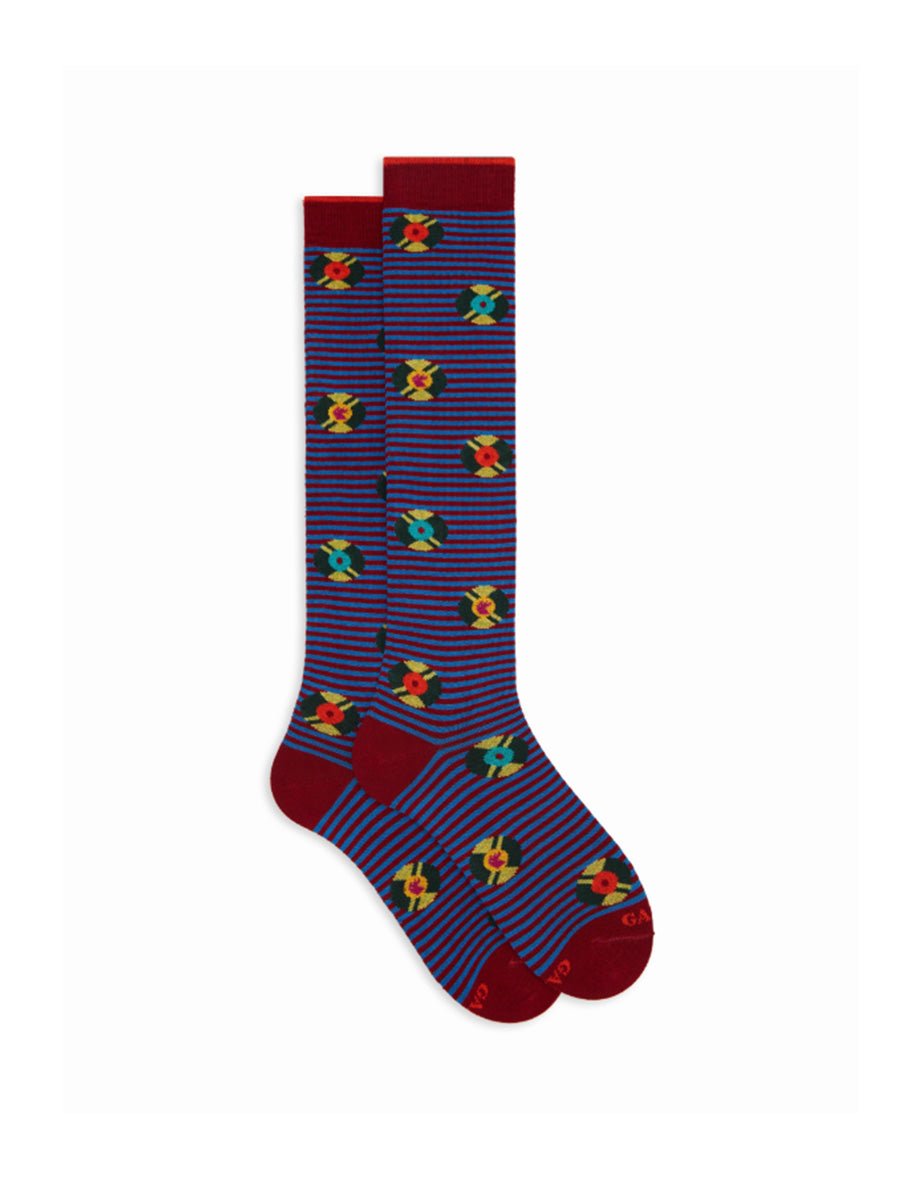 Calze lunghe da uomo, jacquard fantasia vinili multicolor all over su base a righe color amaranto e blu , punta e tallone color amaranto. Logo Gallo riportato in punta a contrasto.