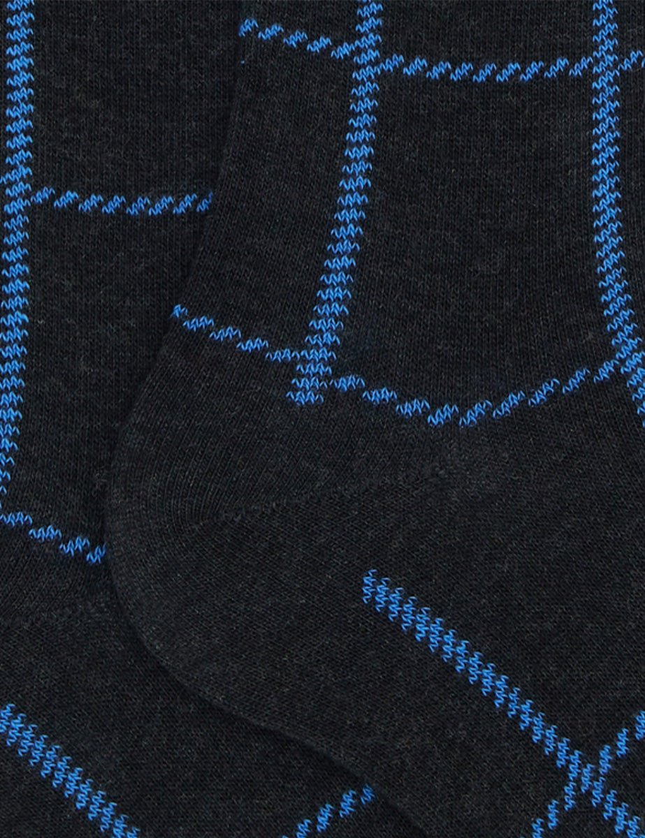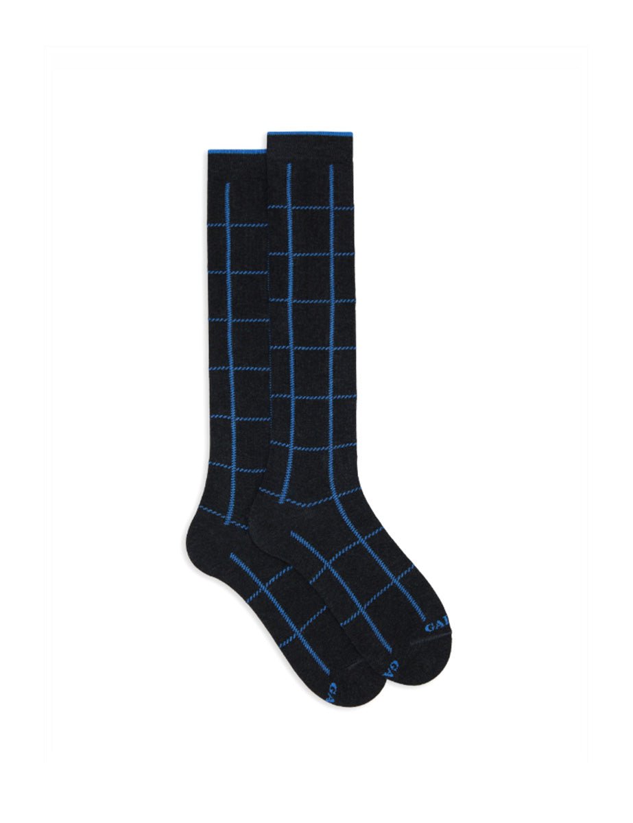Calze lunghe da uomo, motivo check blu elettrico su base color antracite. Logo Gallo riportato in punta a contrasto.