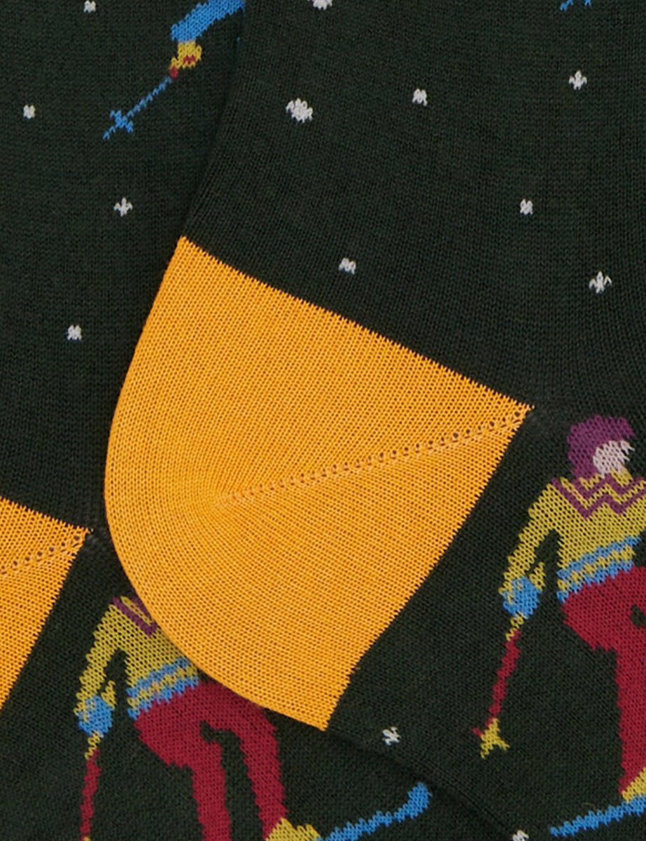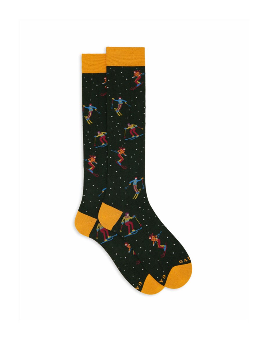 Calze lunghe da uomo, motivo jacquard con sciator su fondo color verde bottiglia. Punta, talloni ed elastico gambale color senape e logo Gallo riportato in punta a contrasto.