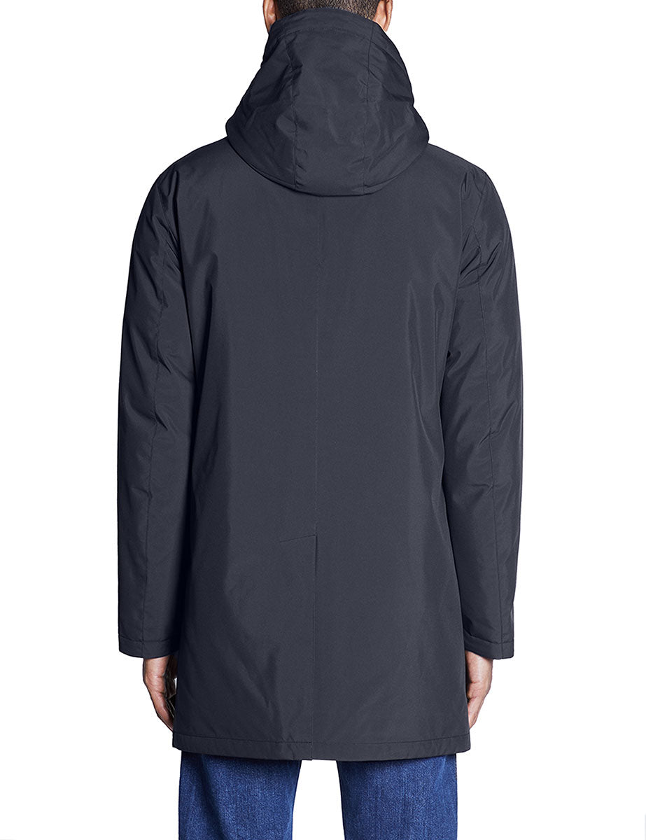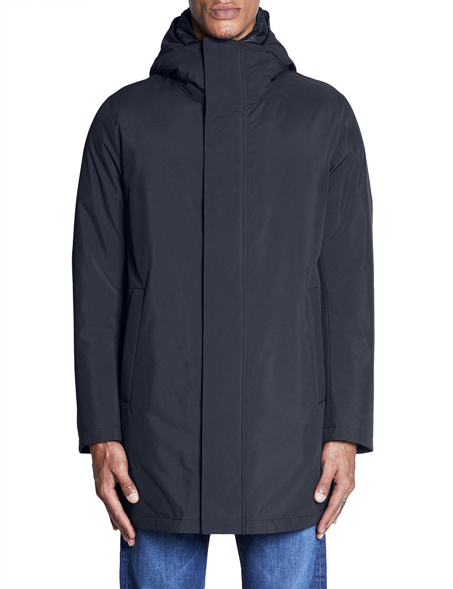 Piumino in tessuto tecnico nero, chiusura monopetto frontale nascosta. Tasche a filetto frontali, manica lunga e collo alto con cappuccio e imbottitura in piuma.