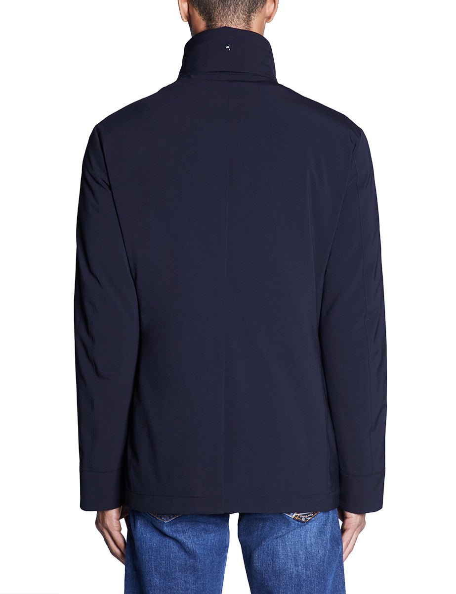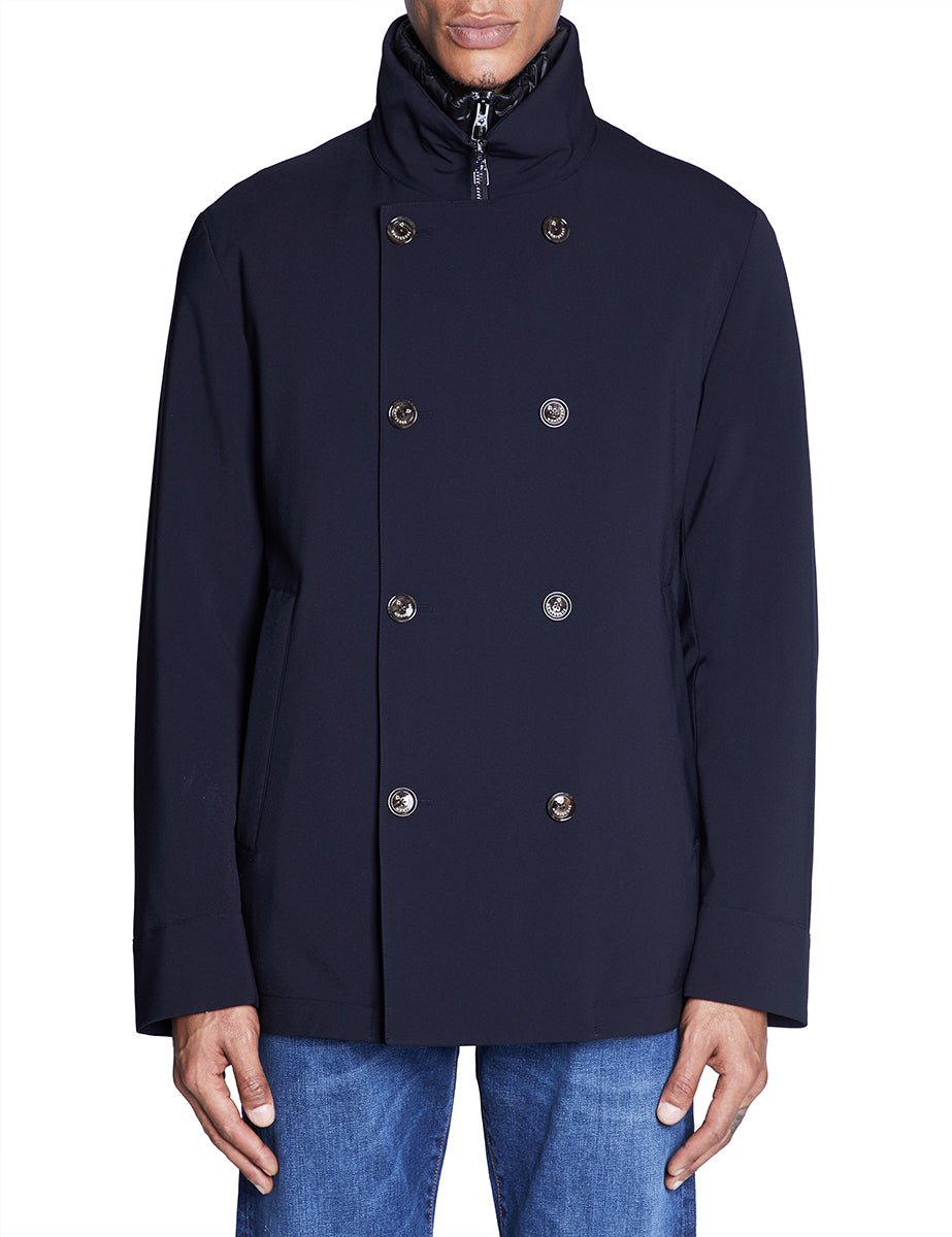 Giacca in tessuto tecnico opaco color blu navy, doppia chiusura frontale con zip e abbottonatura doppiopetto a vista con bottoni in pasta logati. Tasche a filetto frontali, manica lunga e collo montante. Imbottitura in piuma.