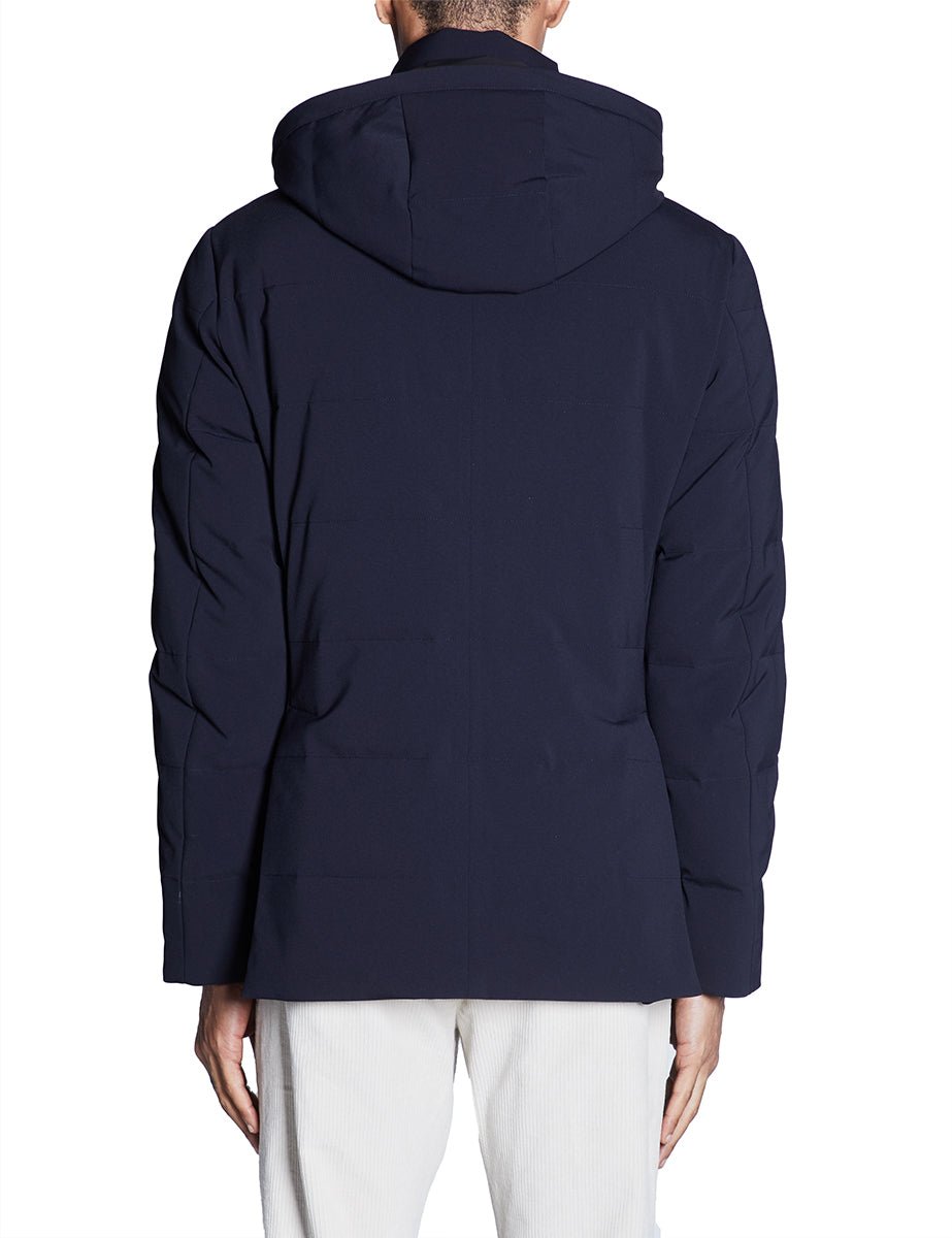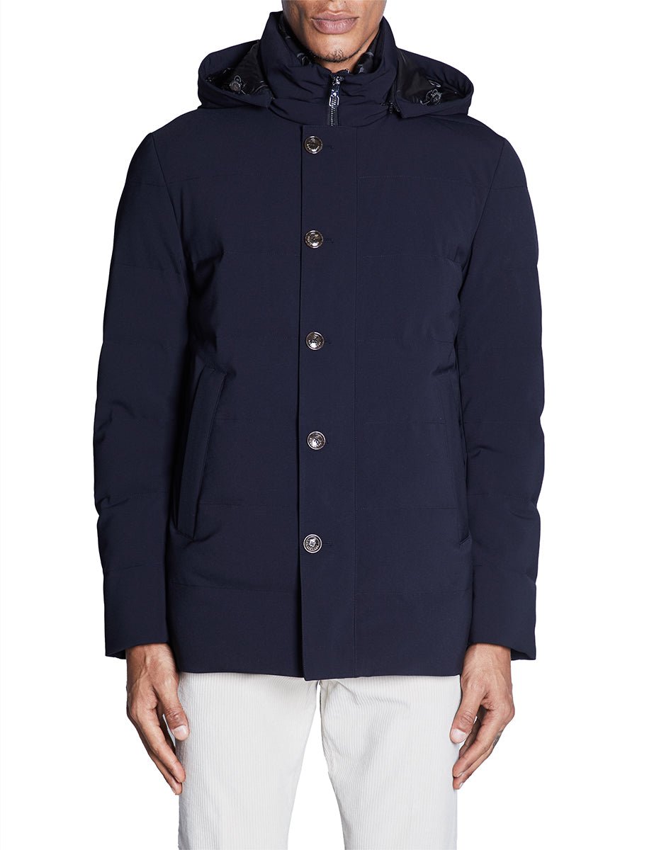 Piumino in tessuto tecnico opaco color blu navy, doppia chiusura frontale con zip e abbottonatura monopetto a vista con bottoni in pasta logati. Tasche a filetto frontali, manica lunga e collo montante. Cappuccio coordinato rimovibile con coulisse e imbottitura in piuma.