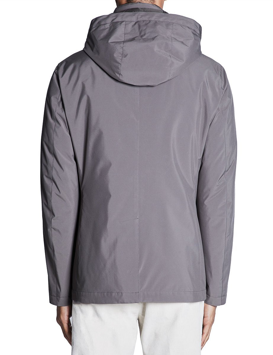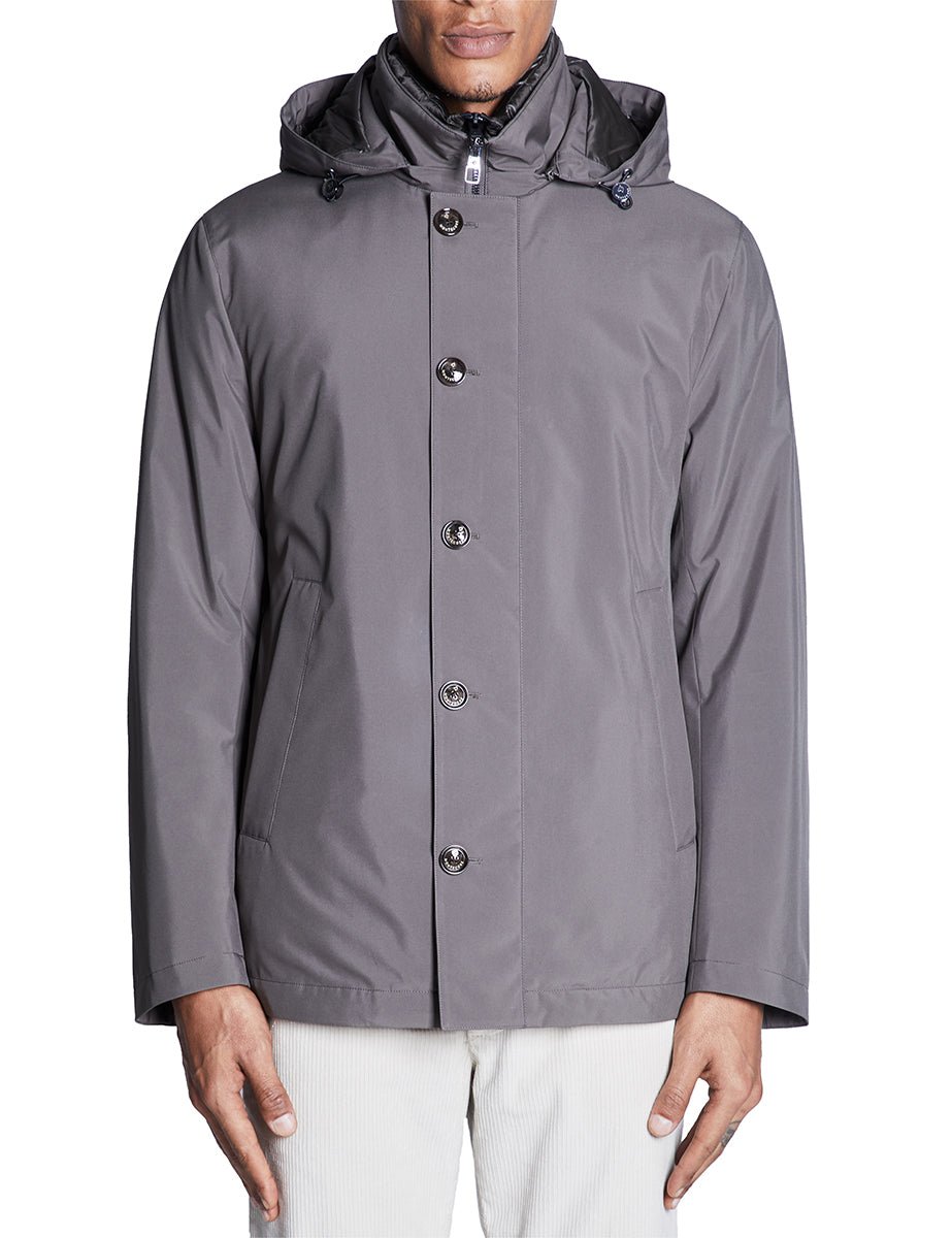 Piumino in tessuto tecnico semilucido color grigio medio, doppia chiusura frontale con zip e abbottonatura monopetto a vista con bottoni in pasta logati. Tasche a filetto frontali, manica lunga e collo montante. Cappuccio coordinato rimovibile con coulisse e imbottitura in piuma.
