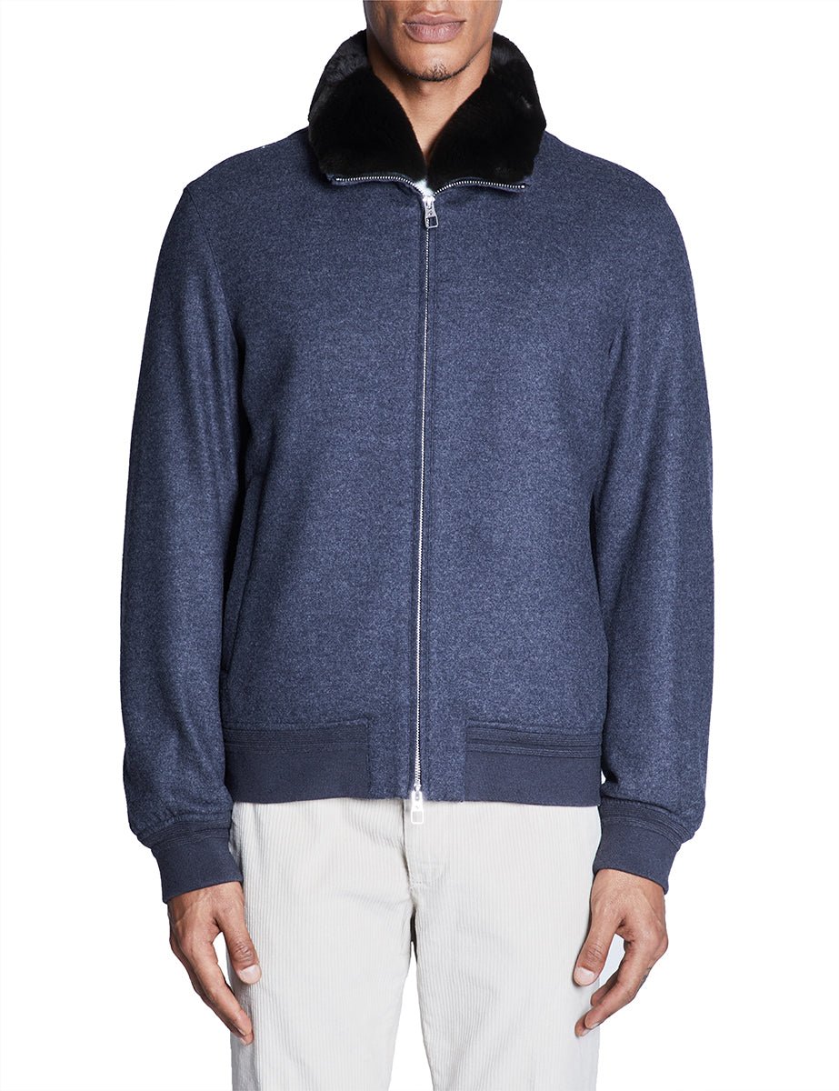 Giacca imbottita in panno di lana color blu mélange. Chiusura frontale con zip metallica e chiusura a doppio cursore, finitura fondo e polsi in maglia a coste in tono. Interno del collo alto con pelliccia color testa di moro e imbottitura in vera piuma.