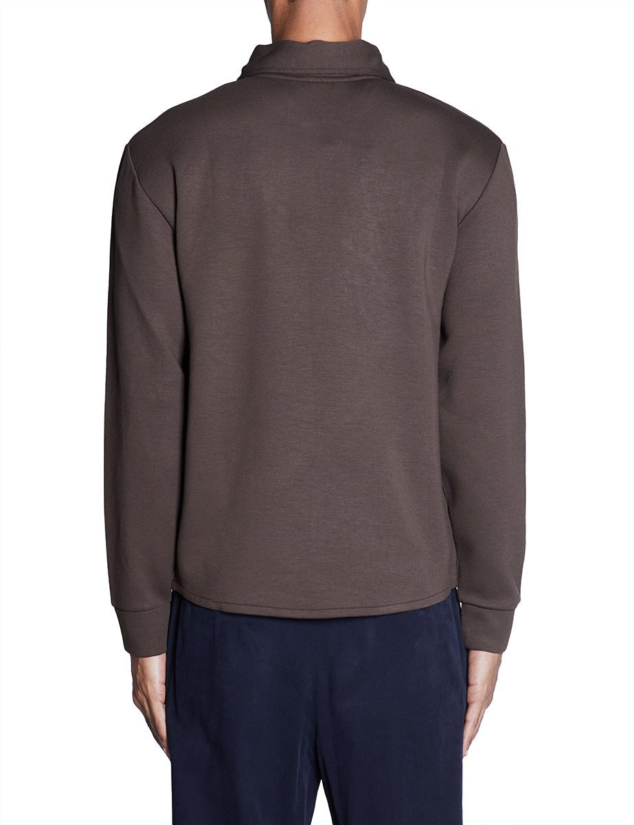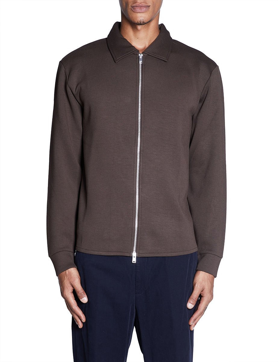 Felpa in jersey pesante color cacao, collo a camicia e manica lunga. Chiusura zip metallica frontale e volume regular.