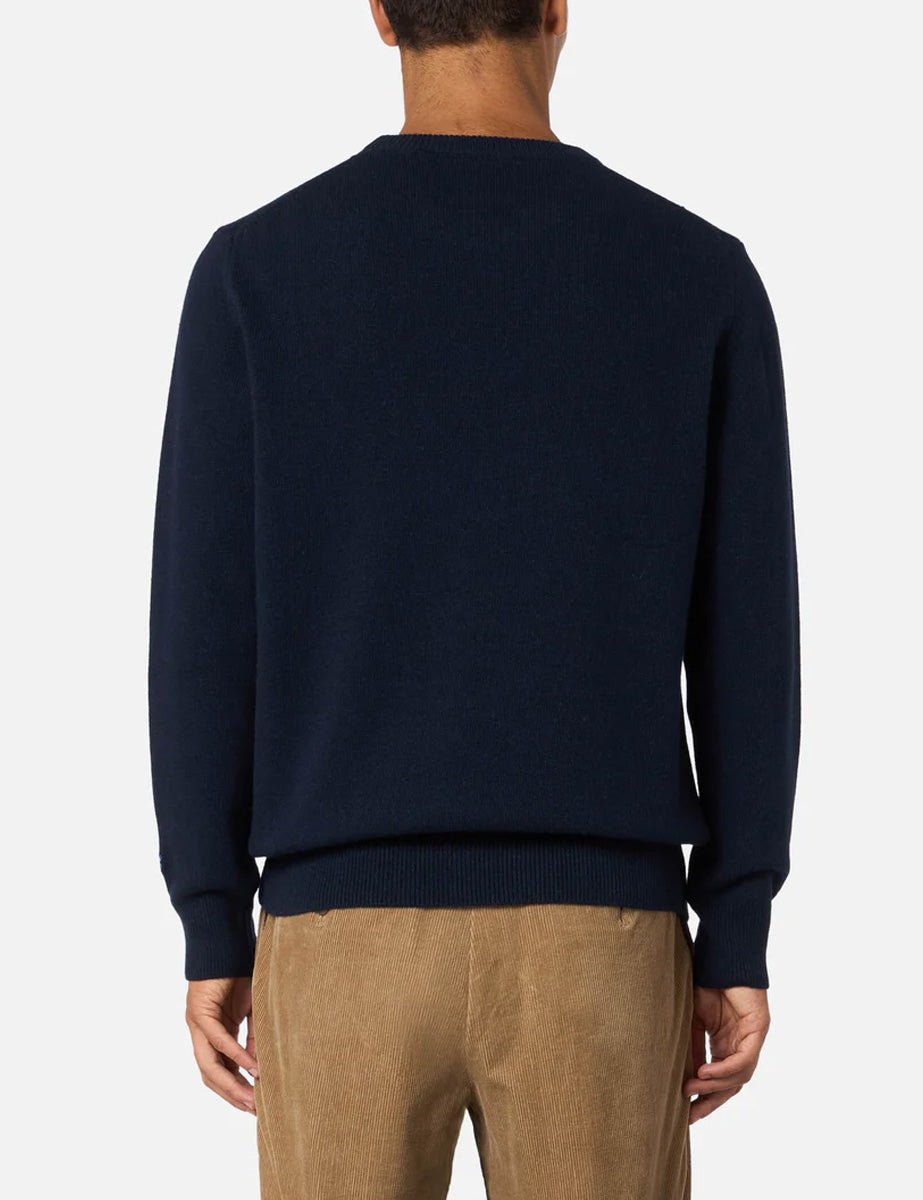 Maglia girocollo in misto lana, cashmere e viscosa color blu oltremare con scritta jacquard “Vacanze di Natale” sul petto. Ricamo logo St. Barth all'altezza del polso e finiture collo, polsi e fondo in costa. Vestibilità regolare.