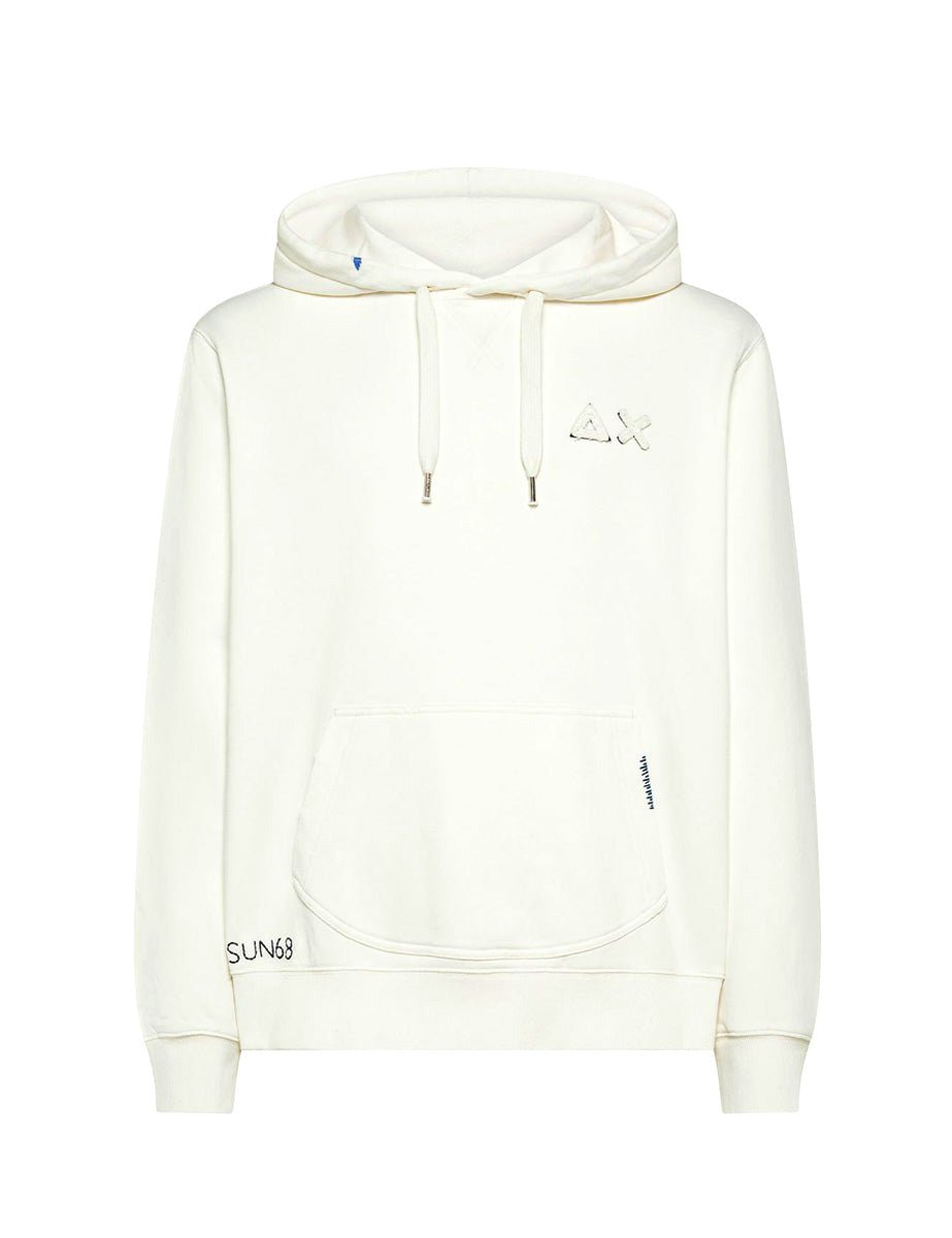 Felpa in cotone color panna effetto vintage con dettagli destroyed. Cappuccio con coulisse, dettagli in filo a contrasto e tasche a marsupio. Patch porta logo ricamato sul petto.
