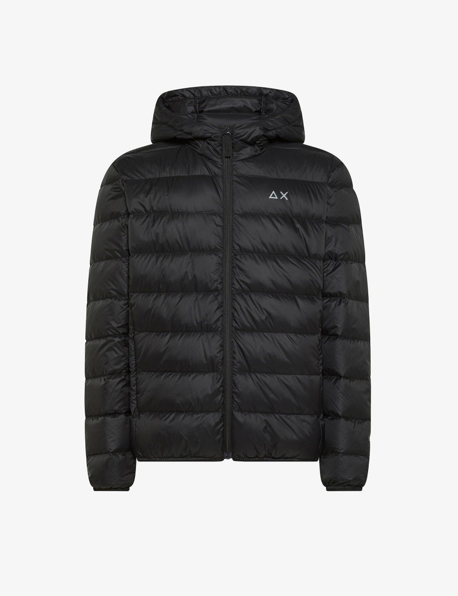 Piumino con cappuccio in nylon color nero, chiusura con zip in tono e logo al petto in contrasto. Tasche nei fianchetti con chiusura con zip invisibile.