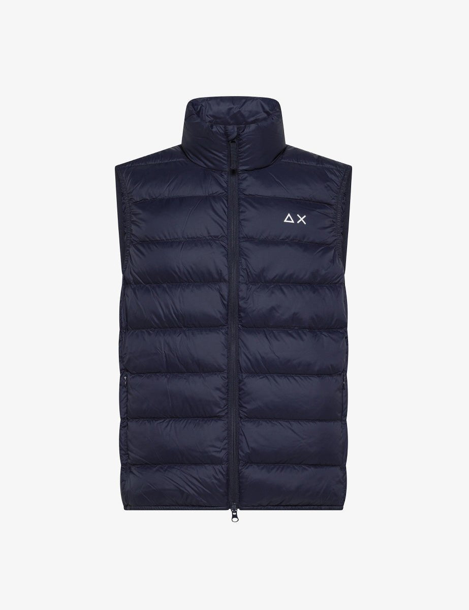 Piumino smanicato in nylon color blu navy, chiusura con zip in tono e logo al petto in contrasto. Collo montante e tasche nei fianchetti con chiusura con zip invisibile.
