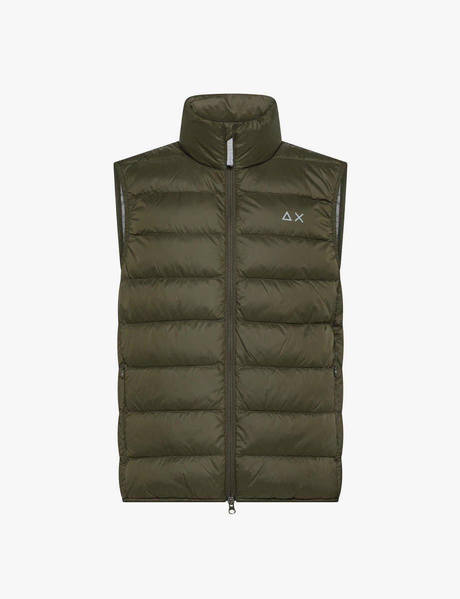 Piumino smanicato in nylon color verde militare, chiusura con zip in tono e logo al petto in contrasto. Collo montante e tasche nei fianchetti con chiusura con zip invisibile.