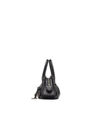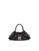 Borsa realizzata in morbida nappa color nero, caratterizzata da un motivo drappeggiato morbido. Presenta una chiusura superiore con zip metallica, due pratici manici superiori in pelle in tono e un ampio scomparto interno con taschina zippata. Frontalmente presente un motivo metallico con portalogo ed è dotata di una tracolla removibile.