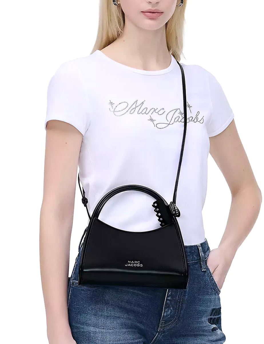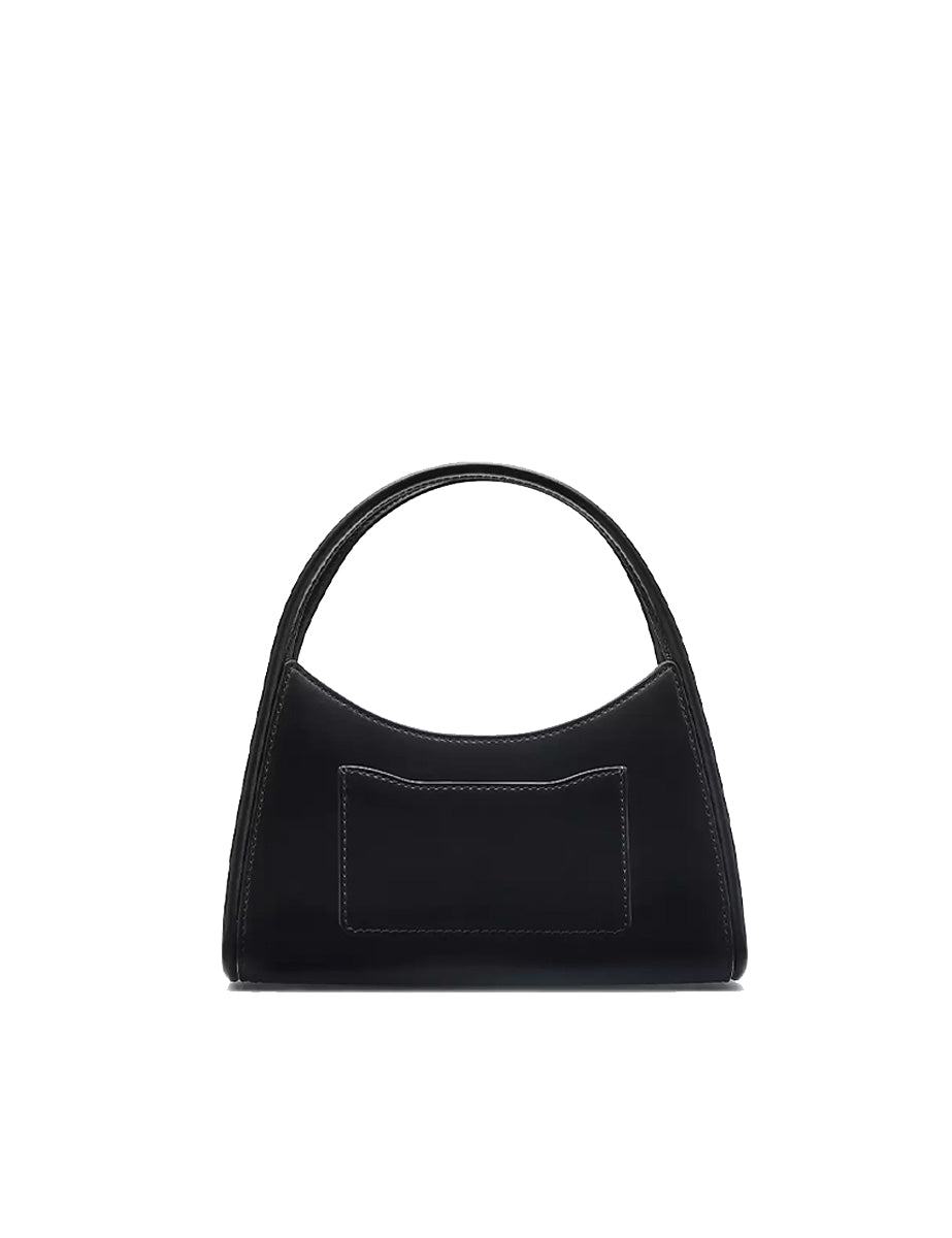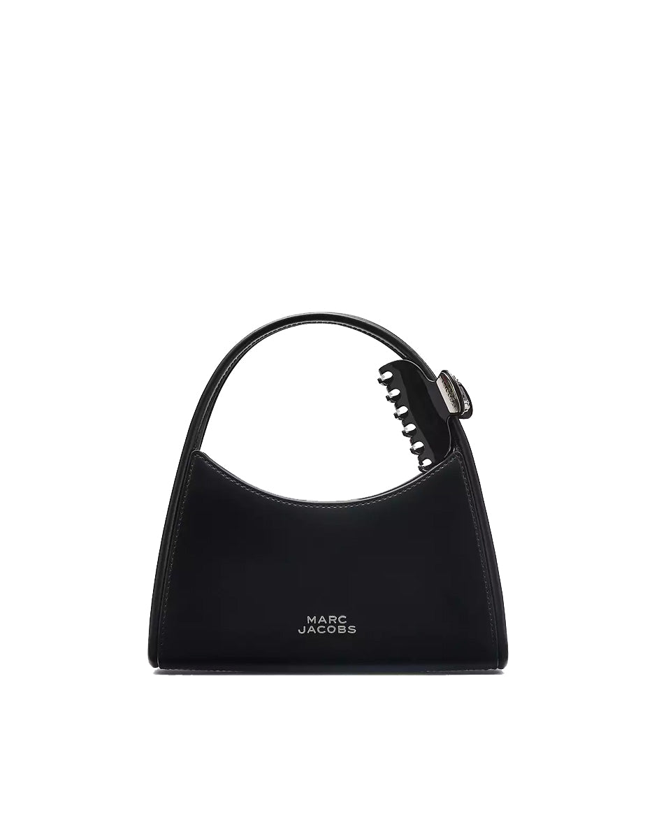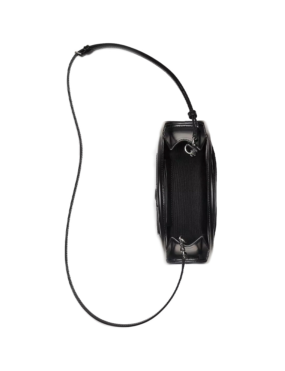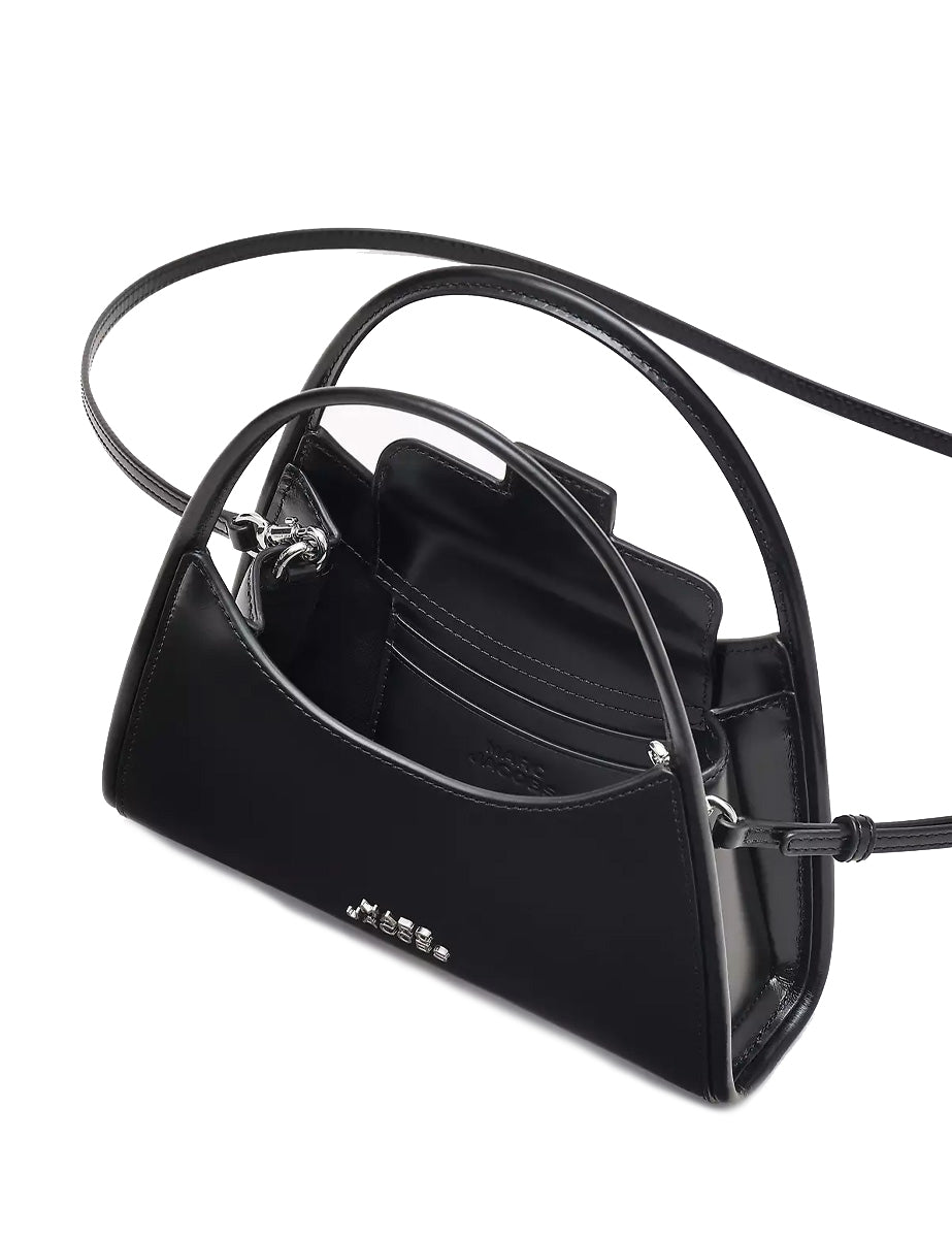 Borsa rigida in pelle spazzolata color nero, chiusura magnetica superiore e doppio manico in tono. Presenta un pratica tasca posteriore e due tasche interne e una tracolla regolabile e removibile in pelle in tono. Dotata di un moschettone per capelli in coordinato, riporta il logo frontalmente con lettering 3D in galvanica argento.
